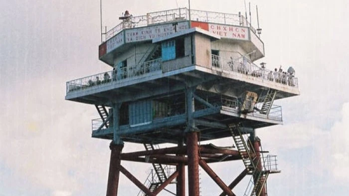 Nhà giàn thế hệ đầu tiên thiết kế dạng pông-tông đóng trên bãi cạn Phúc Tần. (Ảnh tư liệu)