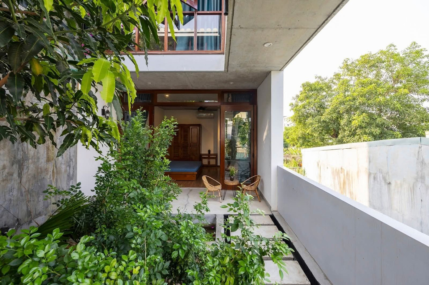 Ánh sáng tự nhiên được dẫn dắt khéo léo vào mọi ngóc ngách, khiến không gian luôn thoáng đãng và chan hòa với thiên nhiên dù nằm sâu trong phố. Những khoảng xanh nhỏ được đan xen tinh tế, như những “lá phổi” mát lành giúp mỗi hơi thở trong nhà đều dễ chịu.