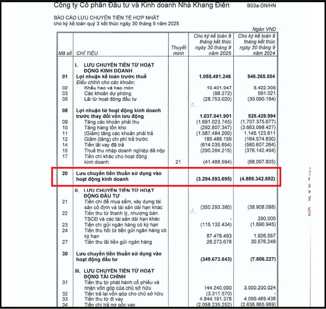 Dòng tiền kinh doanh của KDH âm gần 3.300 tỷ đồng tính đến thời điểm cuối quý III/2025.