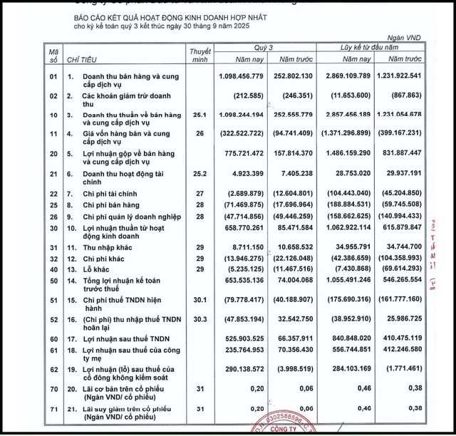 Lũy kế 9 tháng đầu năm 2025, doanh thu thuần đạt 2.857 tỷ đồngvà lợi nhuận sau thuế 841 tỷ đồng, tăng lần lượt 132% và 105% so với cùng kỳnăm 2024. Doanh nghiệp đã hoàn thành 75% kế hoạch doanh thu và 84,1% chỉ tiêu lơịnhuận năm.