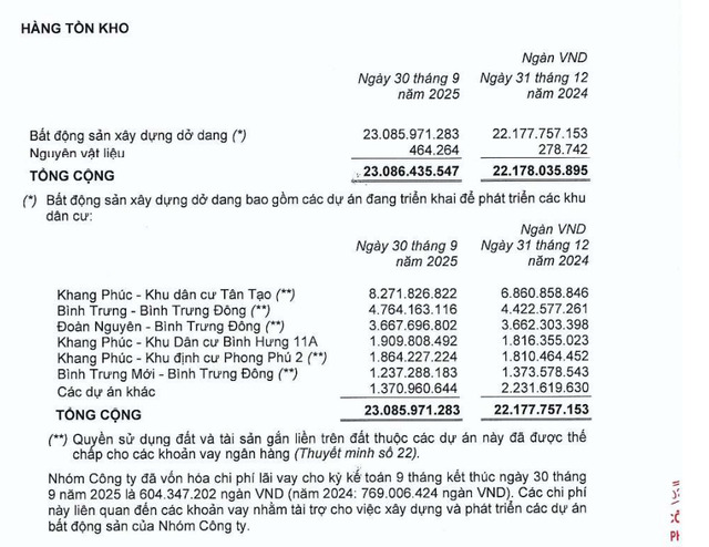 Hàng tồn kho vẫn chiếm tỷ trọng lớn nhất trong cơ cấu tài sảnvới 23.086 tỷ đồng, tăng 4,1%. Trong đó, khu dân cư Tân Tạo chiếm 8.272 tỷ đồng,dự án Bình Trưng Đông 8.432 tỷ đồng và khu dân cư Bình Hưng 11A khoảng 1.910 tỷđồng.