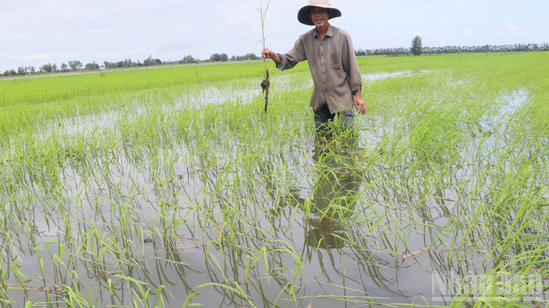 Thạc sĩ Lê Thanh Phong lặn lội ruộng đồng kiểm tra tăng trưởng cây lúa mùa nổi.