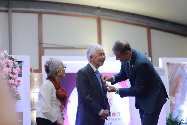 Đại sứ Pháp tại Việt Nam Olivier Brochet trao tặng Huân chương Bắc Đẩu Bội Tinh hạng Sĩ quan cho Giáo sư Trần Thanh Vân.