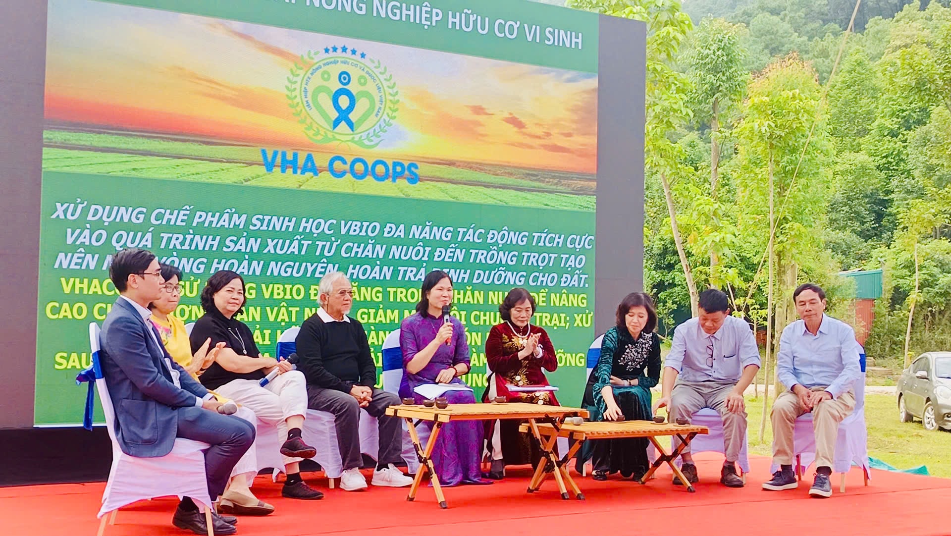 Bà Phạm Thị Lý (áo tím) và Giáo sư Phan Văn Trường (áo đen thứ 4 bên trái) cùng các nhà khoa học uy tín phát động phong trào “Nhất huyết mộc - tủ thuốc xanh cho gia đình bạn - một lá phổi cho Việt Nam xanh". Ảnh: PTL