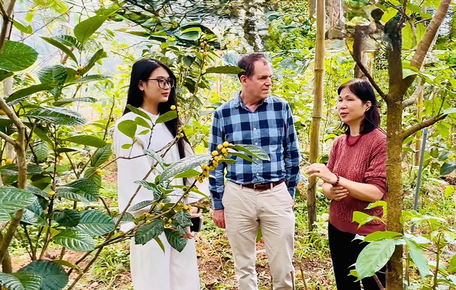 Giáo sư Mỹ John Gallup thăm tìm hiểu mô hình đa hệ sinh học dược liệu, bảo tồn sâm Nhất Dương Sinh và trà hoa vàng của bà Phạm Thị Lý. Ảnh: PTL