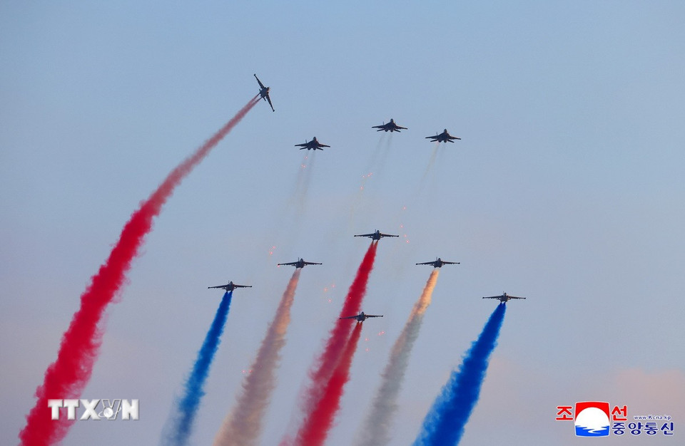 Đội máy bay trình diễn tại Lễ kỷ niệm 80 năm thành lập Không quân Triều Tiên ở sân bay Kalma của Phi đoàn bay Anh hùng Kil Yong Jo số 59, ngày 28/11/2025. (Ảnh: KCNA/TTXVN)