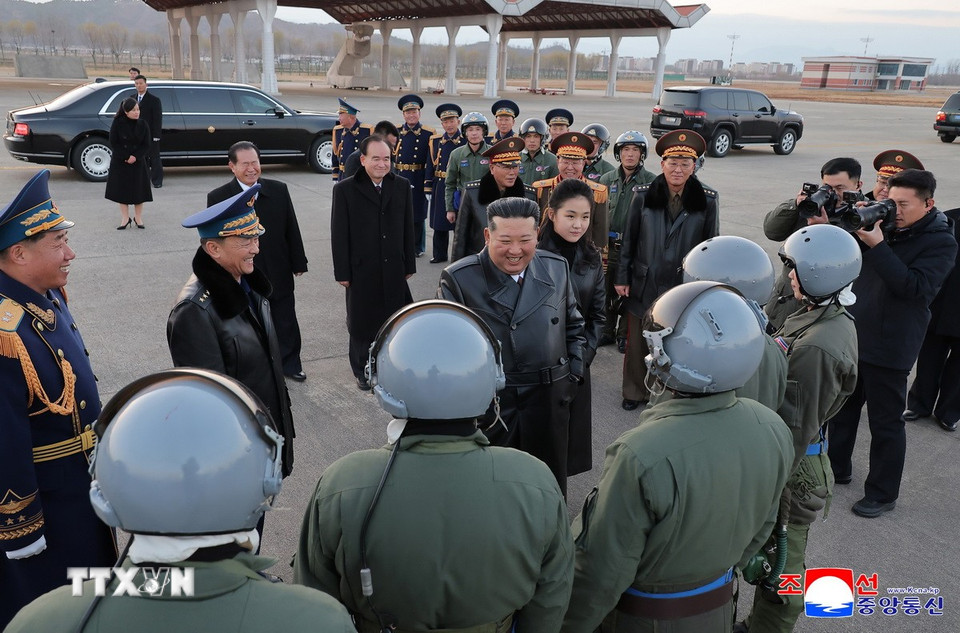 Nhà lãnh đạo Triều Tiên dự Lễ kỷ niệm 80 năm thành lập Không quân tại sân bay Kalma của Phi đoàn bay Anh hùng Kil Yong Jo số 59, ngày 28/11/2025. (Ảnh: KCNA/TTXVN)