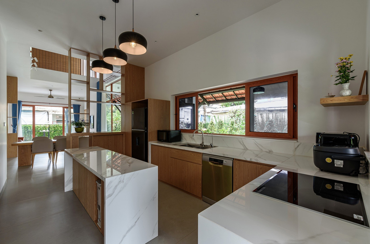 Nhà bếp bố trí dọc theo chiều dài nhà, sử dụng tông trắng và gỗ sáng. Ảnh: Lonton Studio