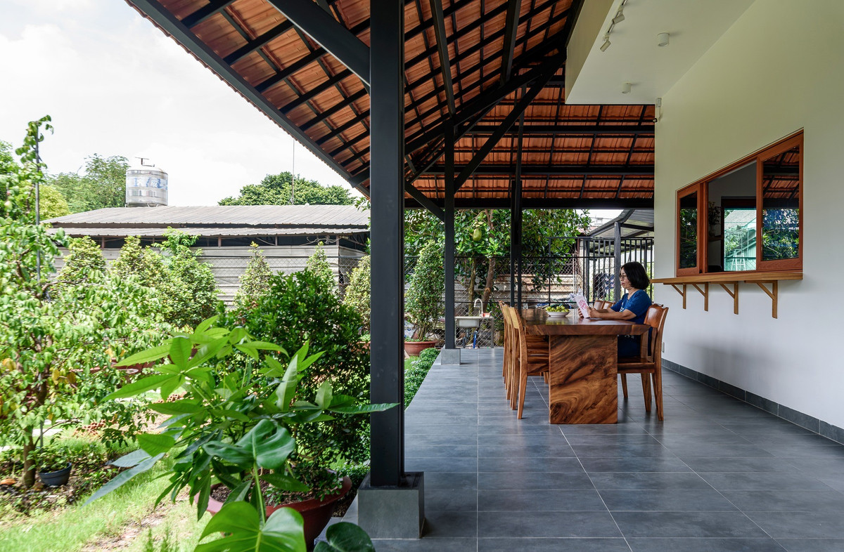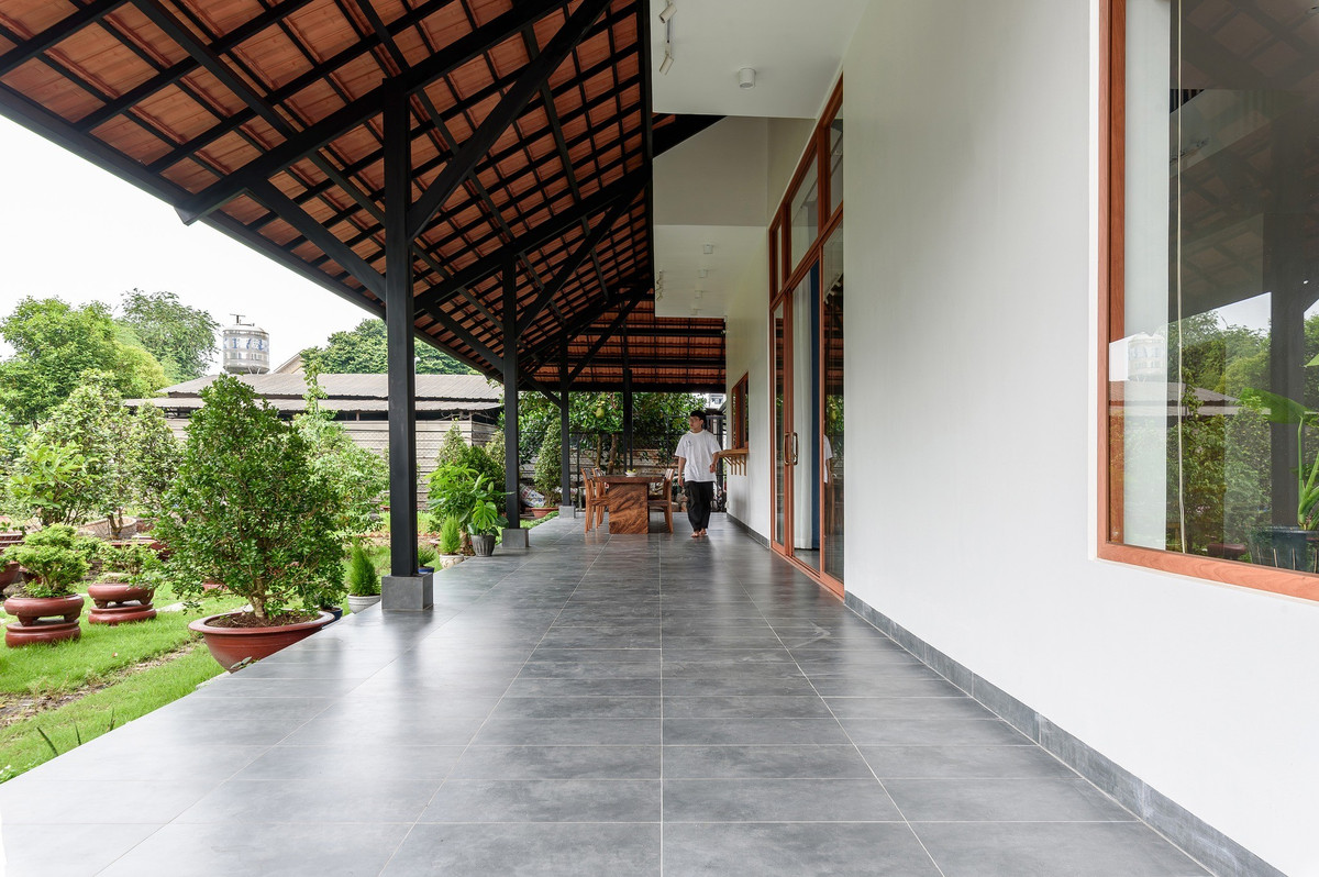 Hàng hiên dài bao quanh nhà tạo nên lớp đệm mát mẻ, giúp không gian luôn thoáng gió, đồng thời là nơi gia đình có thể trò chuyện cùng xóm giềng mỗi chiều mà vẫn giữ được sự riêng tư. Ảnh: Lonton Studio