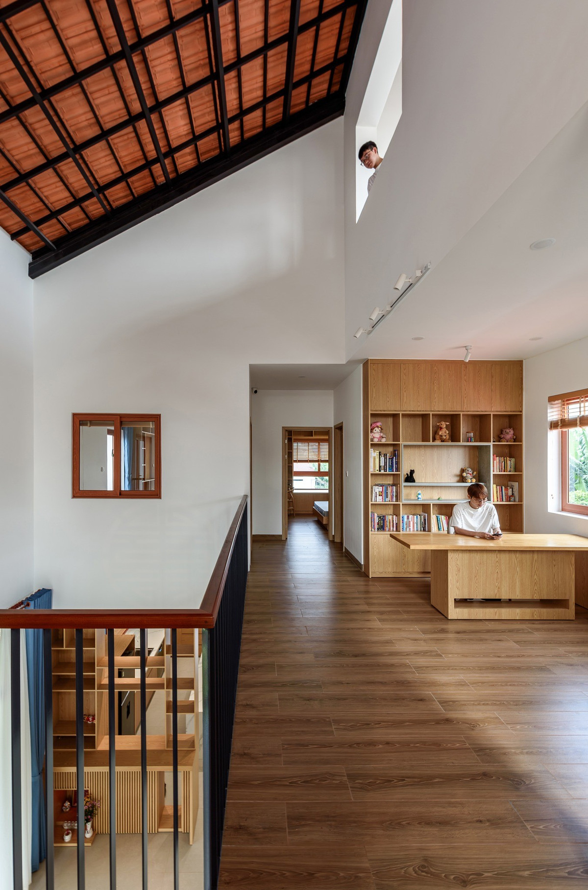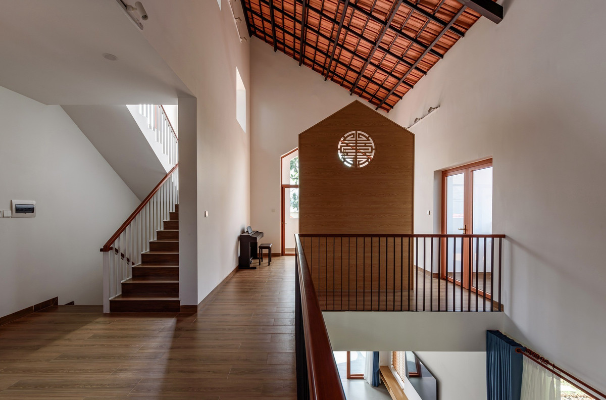 Tầng trên sử dụng vật liệu gỗ tông nâu đồng bộ. Ảnh: Lonton Studio