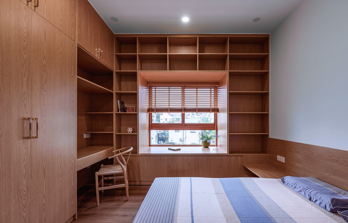 Giường, tủ và hệ kệ sách sử dụng gỗ đồng bộ trong phòng ngủ. Ảnh: Lonton Studio