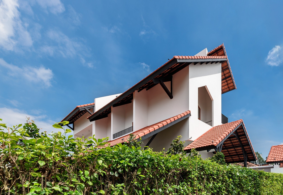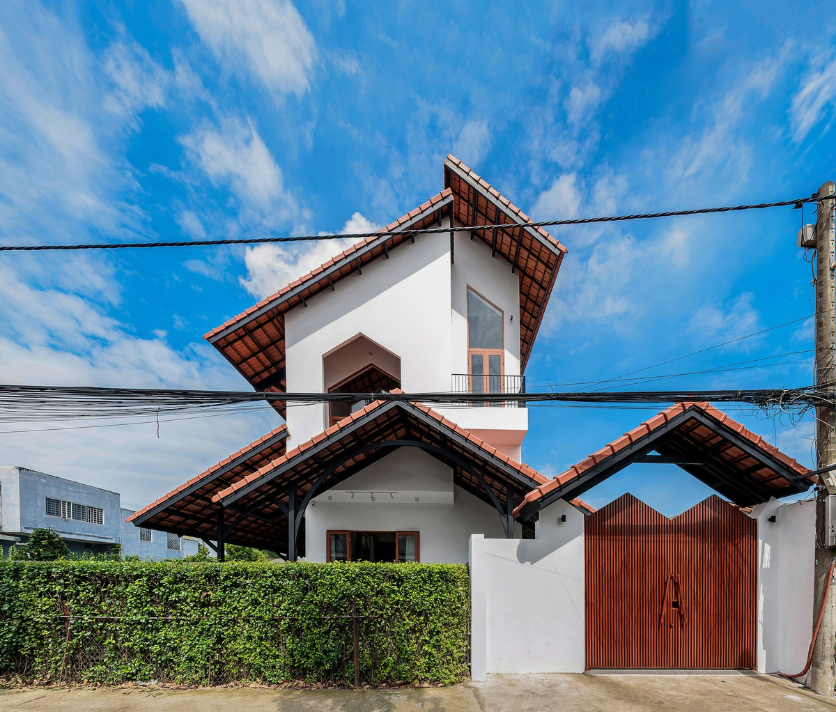 Công trình mang dáng dấp truyền thống quen thuộc nhưng được cách điệu bằng những đường nét bê tông hiện đại, vừa thân thuộc vừa tươi mới. Ảnh: Lonton Studio