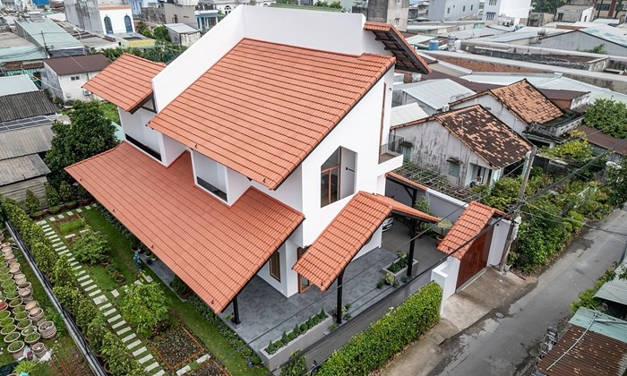 Ngôi nhà sử dụng gạch ngói đỏ, bê tông và gỗ, mang đến tổng thể hài hòa giữa truyền thống và hiện đại. Ảnh: Lonton Studio