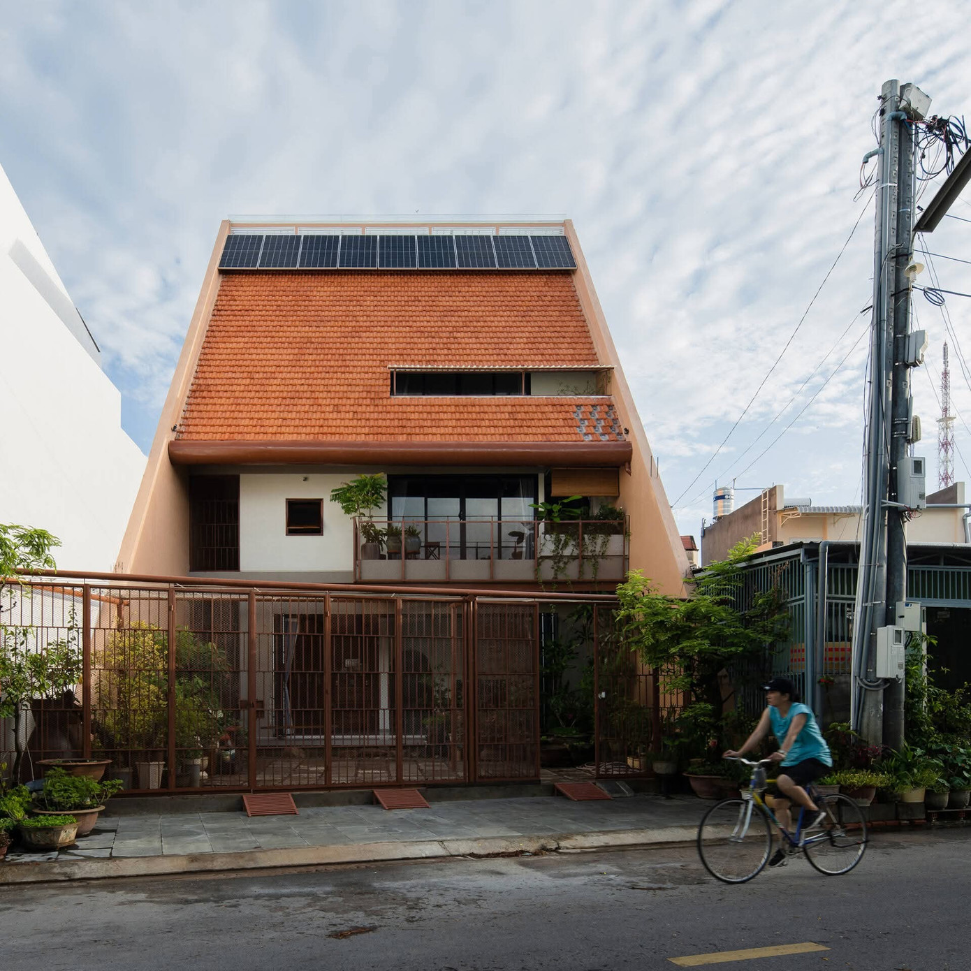 Ngôi nhà lợp mái ngói truyền thống nhưng mặt đứng được thiết kế như một lát cắt thú vị. Vừa nổi bật, vừa hài hòa với bối cảnh xung quanh.