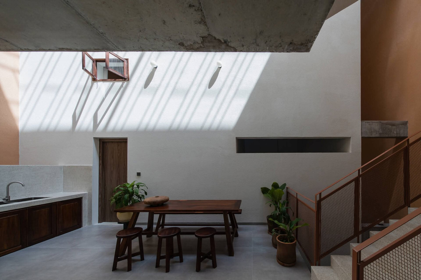 Dù là nhà phố nhưng bên trong vẫn tràn ngập ánh sáng với khe sáng chạy dọc theo mái. Cho gia chủ những khoảng không vô tận khi ngước nhìn bầu trời ngay trong nhà.