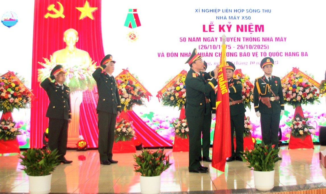 Thừa ủy quyền của Chủ tịch nước, Trung tướng Đinh Quốc Hùng, Bí thư Đảng ủy, Chính ủy Tổng cục Công nghiệp quốc phòng gắn Huân chương Bảo vệ Tổ quốc hạng Ba lên Quân kỳ Quyết thắng của Nhà máy X50.