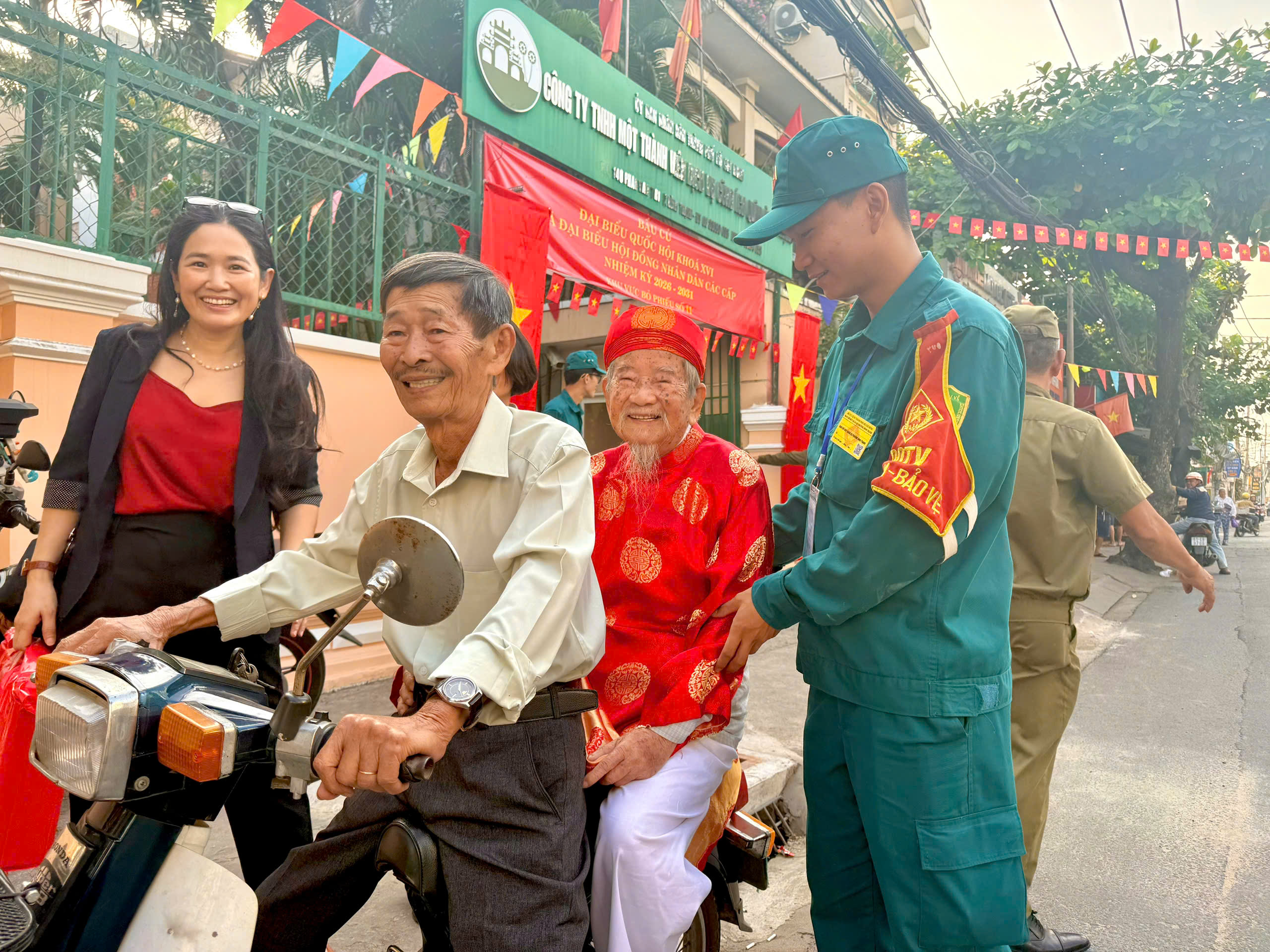 Bí thư Đảng ủy phường Bình Thạnh Vũ Ngọc Tuất hỗ trợ nhà nghiên cứu Nguyễn Đình Tư tại điểm bỏ phiếu. Ảnh: HẢI NHI