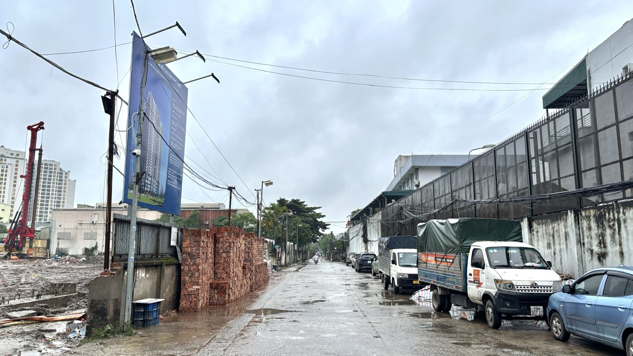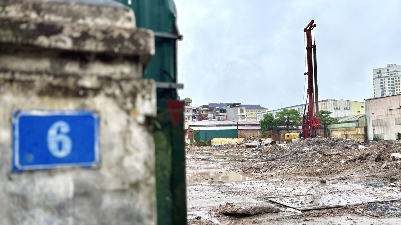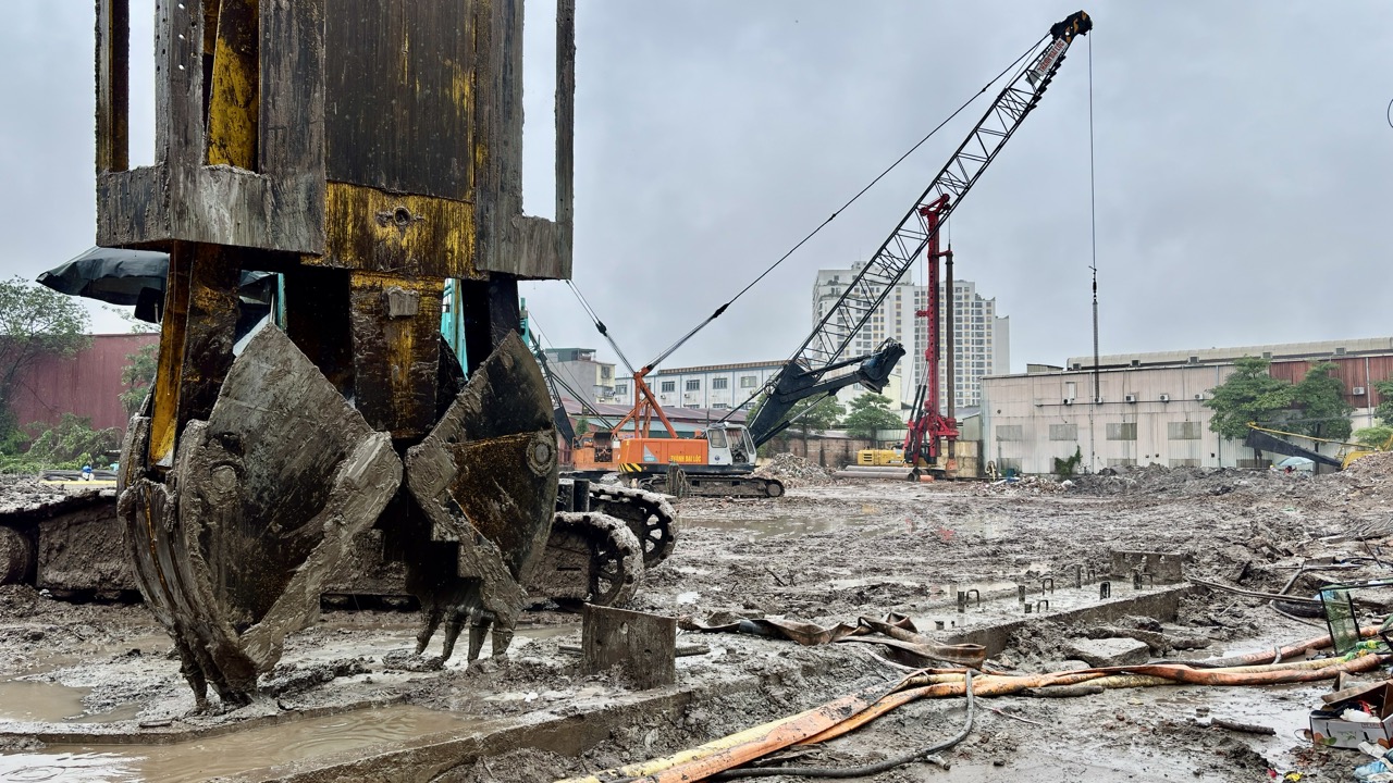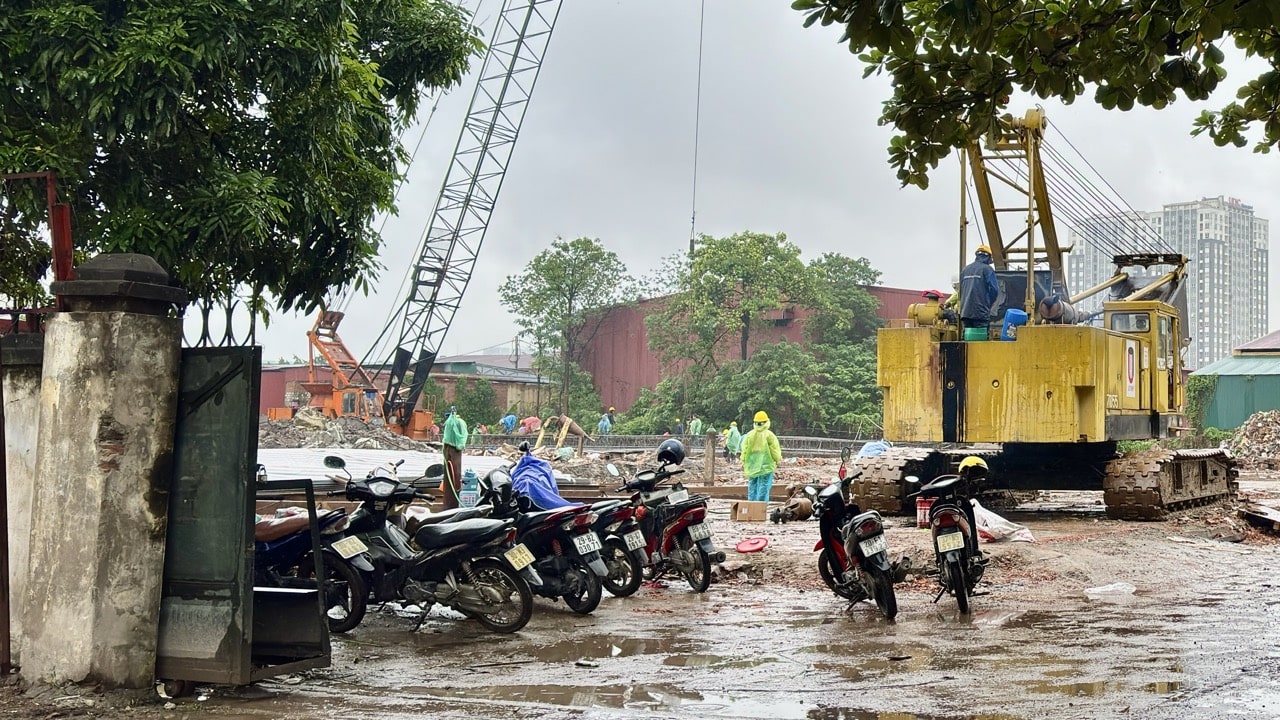 Hiện dự án đang thi công phần móng và triển khai hạ tầng kỹ thuật. Các công nhân vẫn miệt mài làm việc dưới trời mưa.