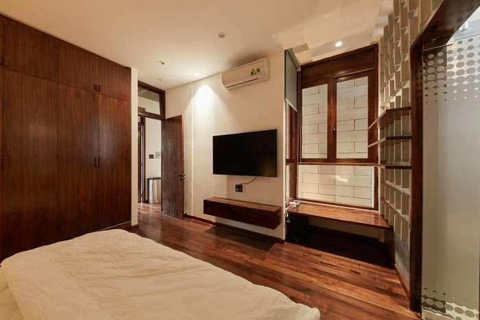 Không gian nghỉ ngơi ở các tầng trên tiếp tục thể hiện sự kết nối với thiên nhiên. Giếng trời và khe thoáng bên hông giúp không gian phòng ngủ luôn sáng và thông gió tự nhiên. Ảnh: Thiết Vũ