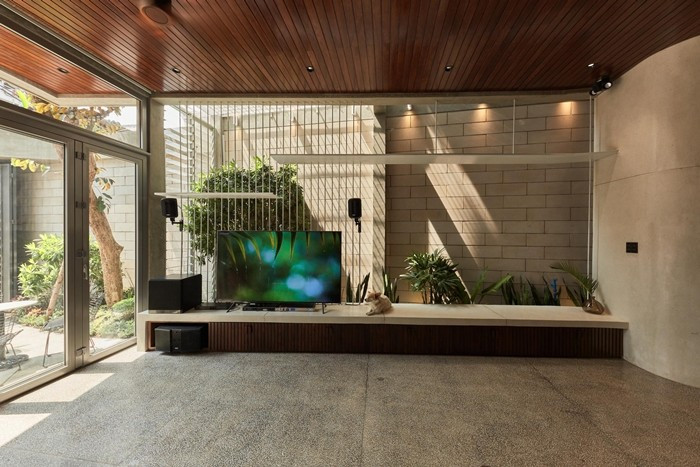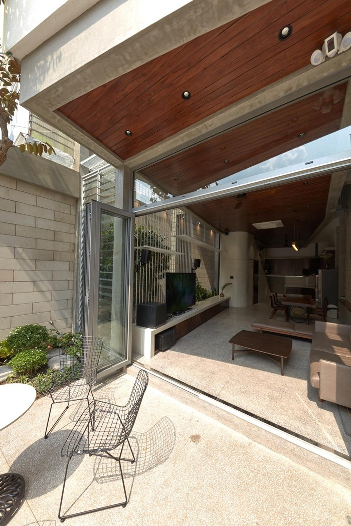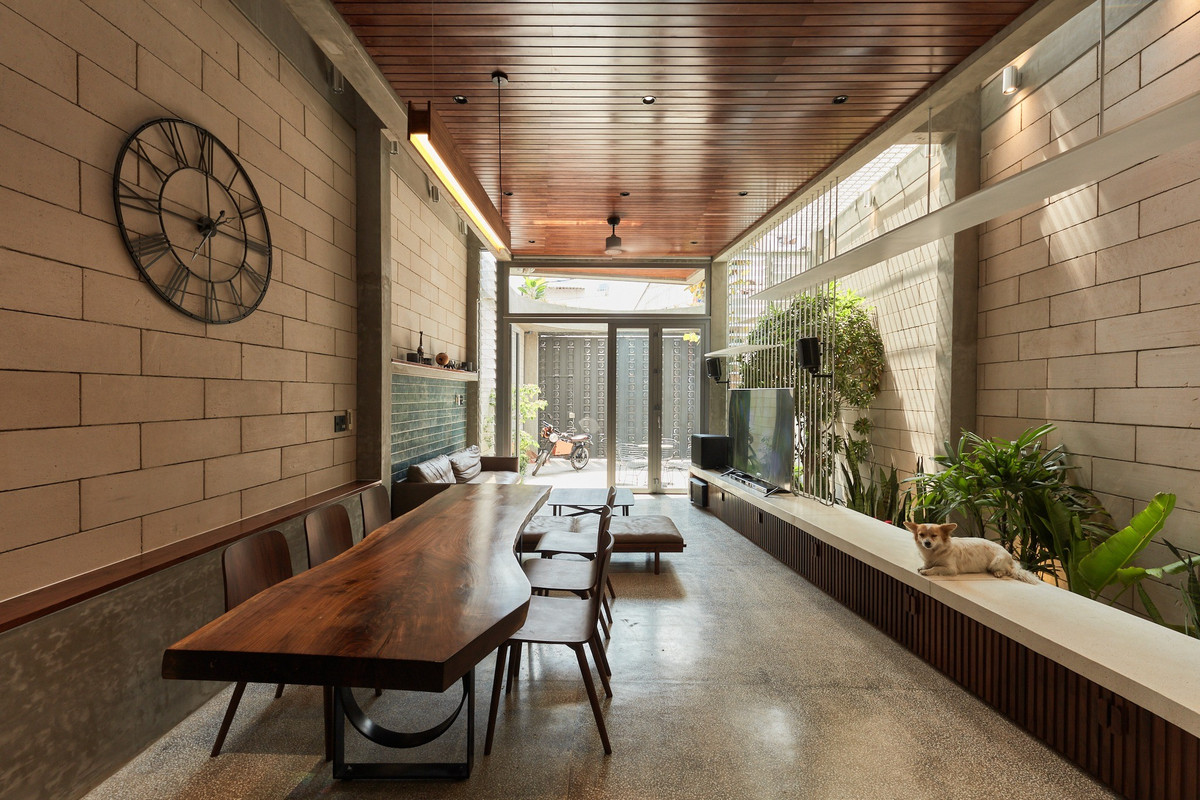 Nằm trong một con hẻm nhỏ tại TP HCM, song ngôi nhà vẫn đáp ứng mong muốn của gia chủ về một khoảng sân rộng, có cây xanh lớn để tạo nên nơi sinh hoạt ngoài trời chan hòa thiên nhiên. Ảnh: Thiết Vũ