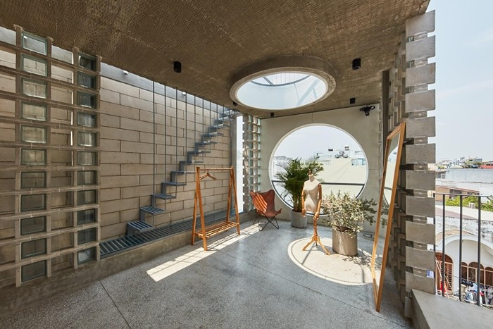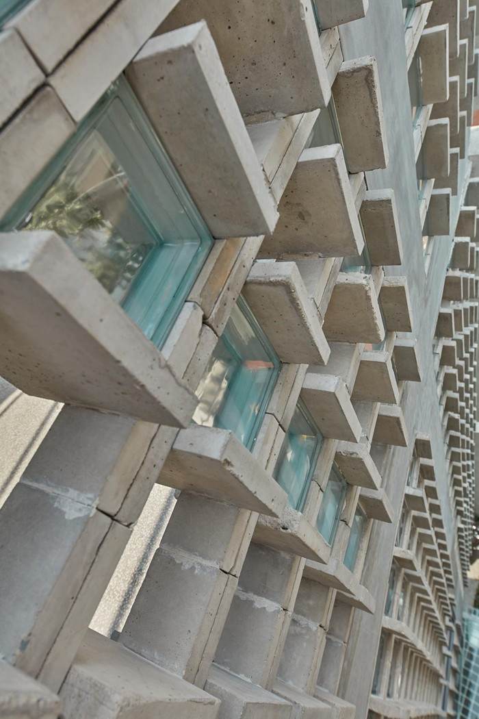 Hệ bông gió kết hợp gạch kính và bê tông, không chỉ tạo điểm nhấn thẩm mỹ mà còn giúp giảm nhiệt. Ảnh: Thiết Vũ