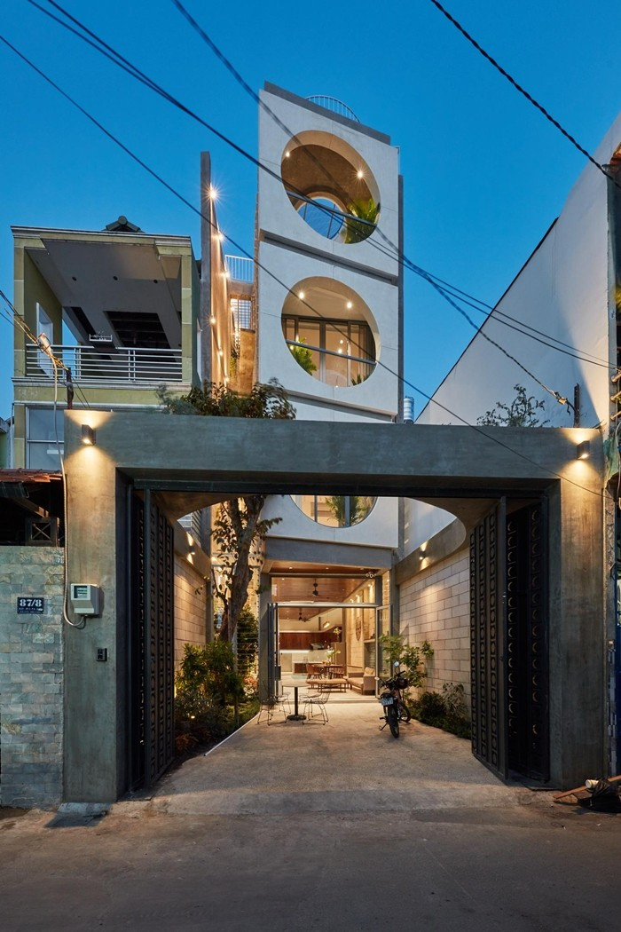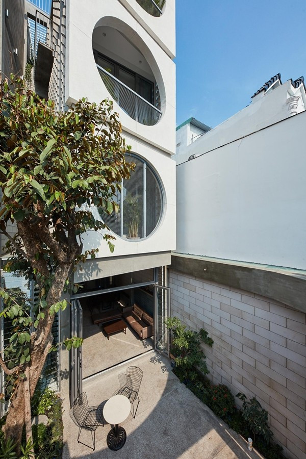 Nhờ giải pháp này, không gian bên trong luôn tràn ngập ánh sáng và gió, đồng thời tăng sự riêng tư khi mặt tiền được xoay chéo so với trục đường hẻm. Ảnh: Thiết Vũ