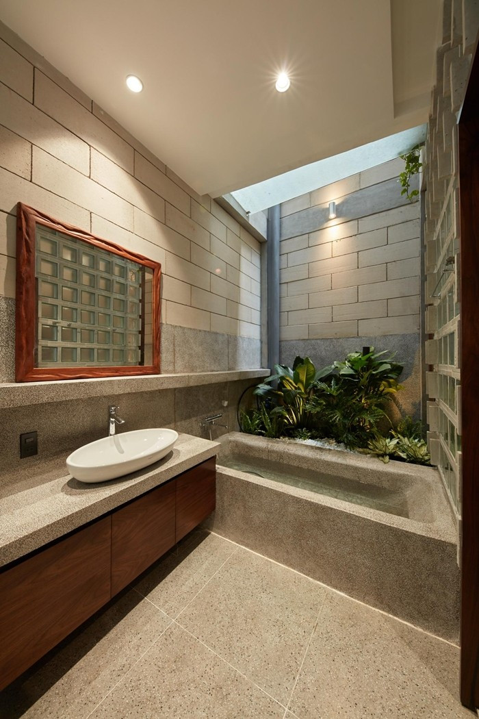 Khu vệ sinh nối liền phòng ngủ, có bồn tắm bê tông đón ánh sáng tự nhiên từ giếng trời giúp tận dụng tối đa ánh sáng tự nhiên và thông gió. Ảnh: Thiết Vũ