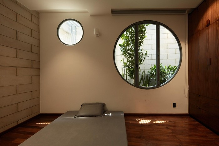 Các phòng ngủ phụ có cửa sổ tròn mở ra bồn cây xanh, đưa thiên nhiên vào từng góc nhỏ. Ảnh: Thiết Vũ