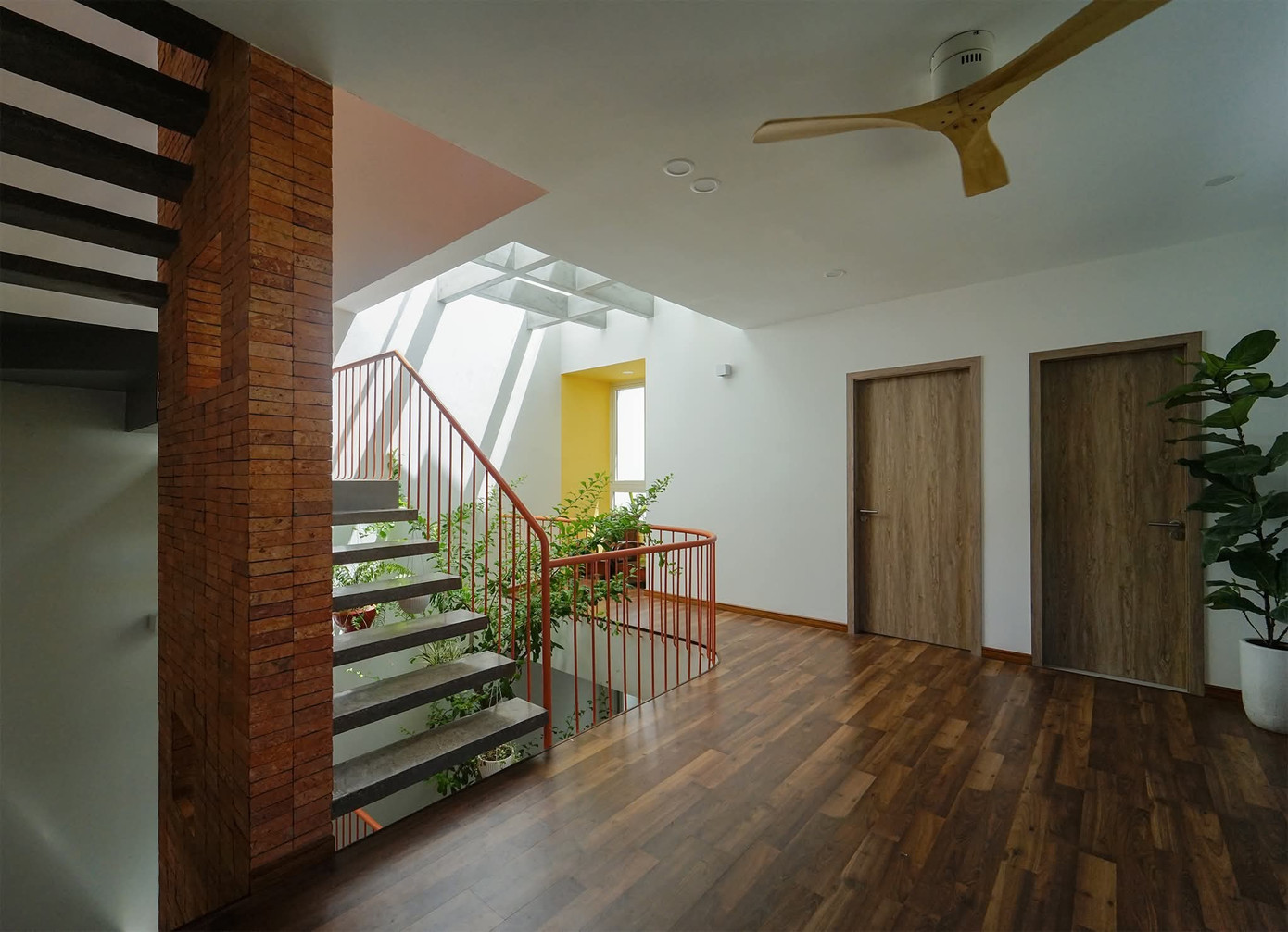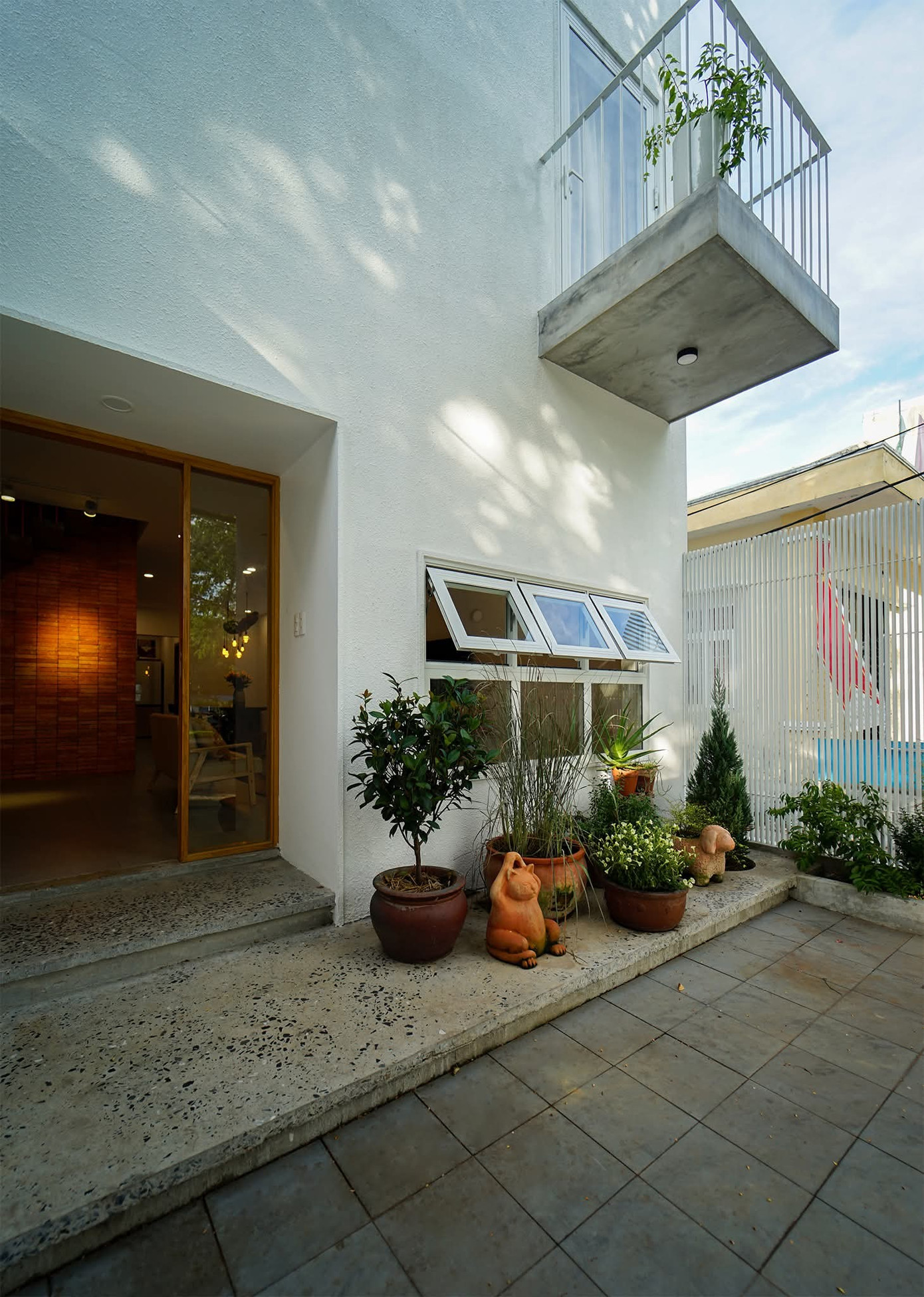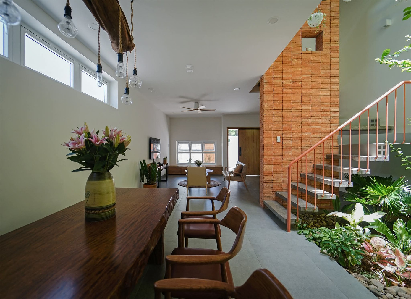 Căn nhà hướng nội nhưng vẫn giữ được sự kết nối với mặt tiền kín đáo được trổ những khoảng trống đan xen.
