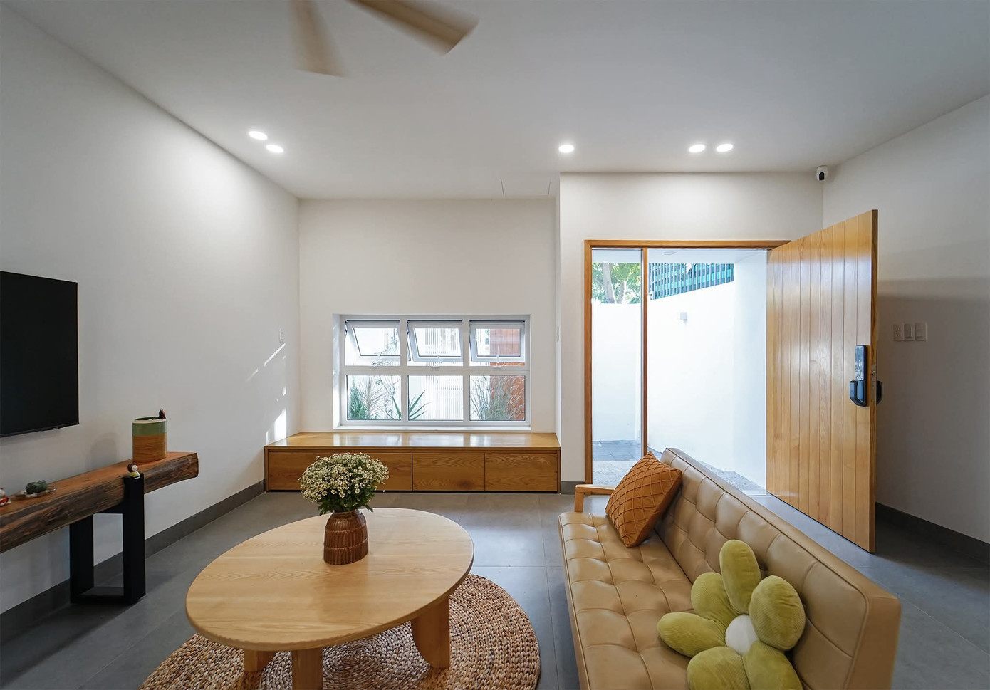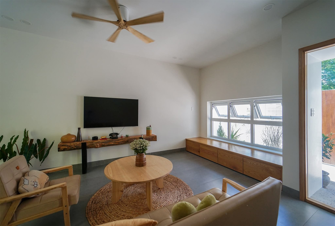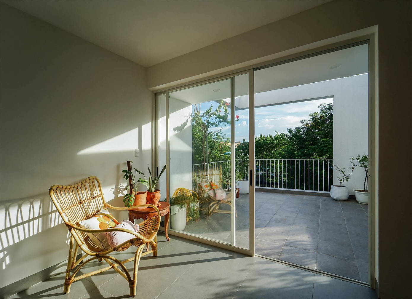 Ánh sáng di chuyển qua từng khung cửa, phản chiếu lên những bức tường mộc mạc, tạo nên nhịp điệu riêng cho không gian sống.