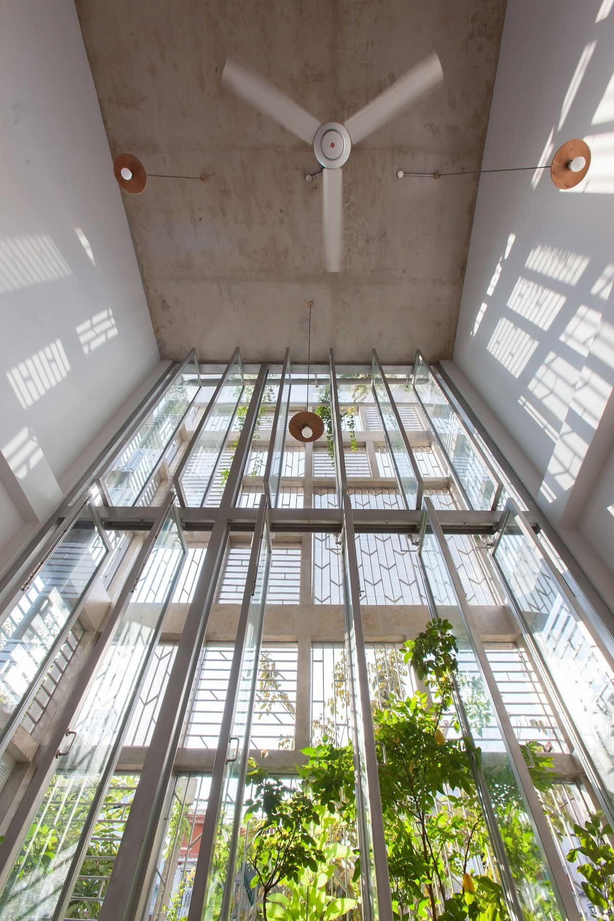 Thiết kế có các khoảng đóng mở với khung lam bê tông, cửa kính cao, và dây leo mặt tiền để không gian bên trong có thể linh hoạt mở ra hoặc đóng kín tùy thời điểm.