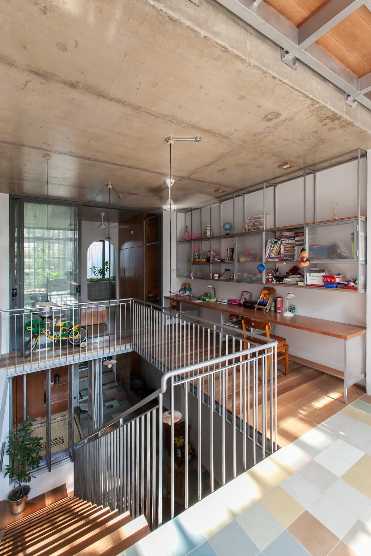 Những khoảng thông tầng lệch tầng được đặt khéo để kết nối các tầng lầu, để mỗi người trong gia đình dù ở phòng riêng vẫn cảm nhận được sự gắn kết với các thành viên khác.