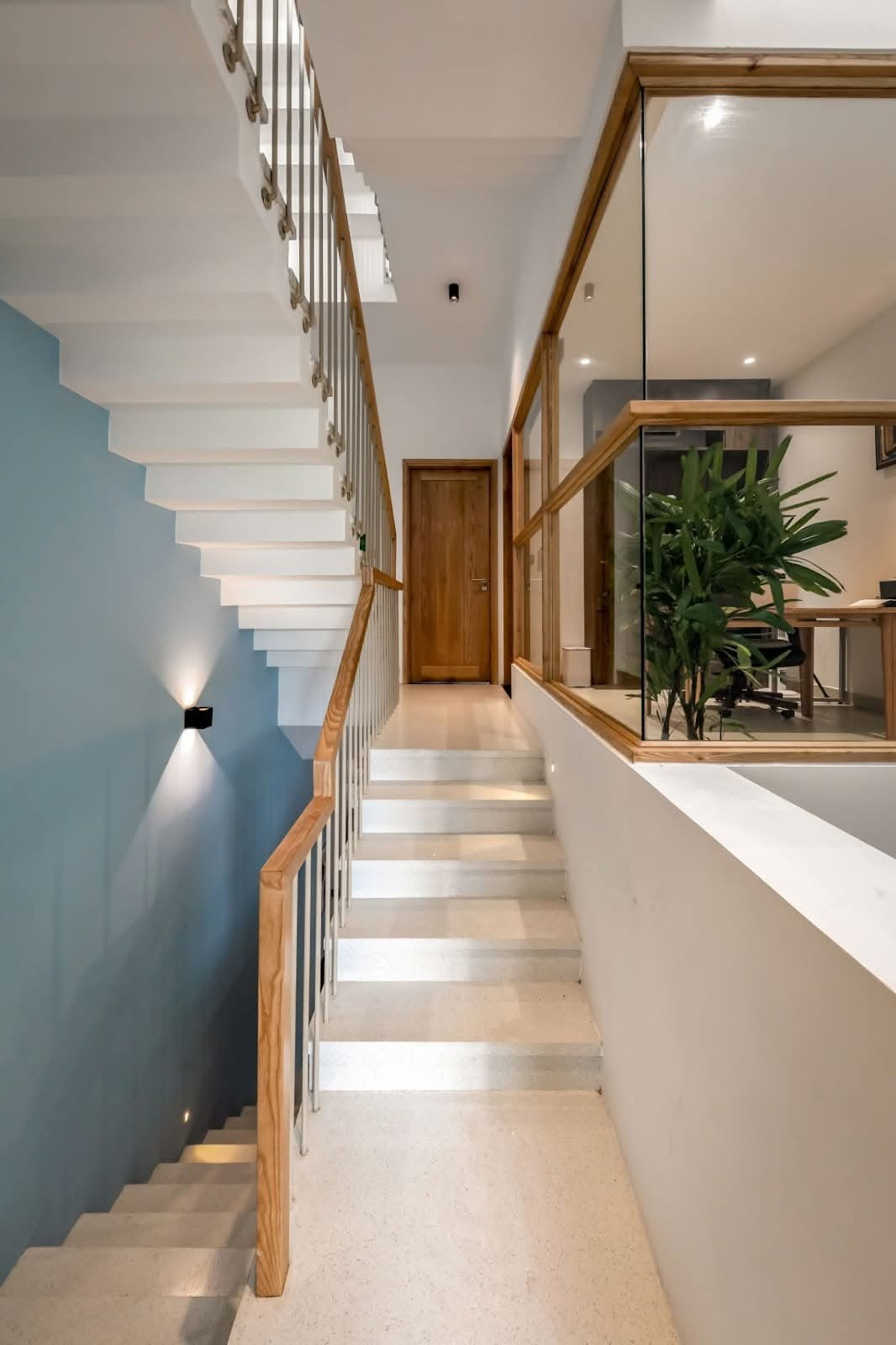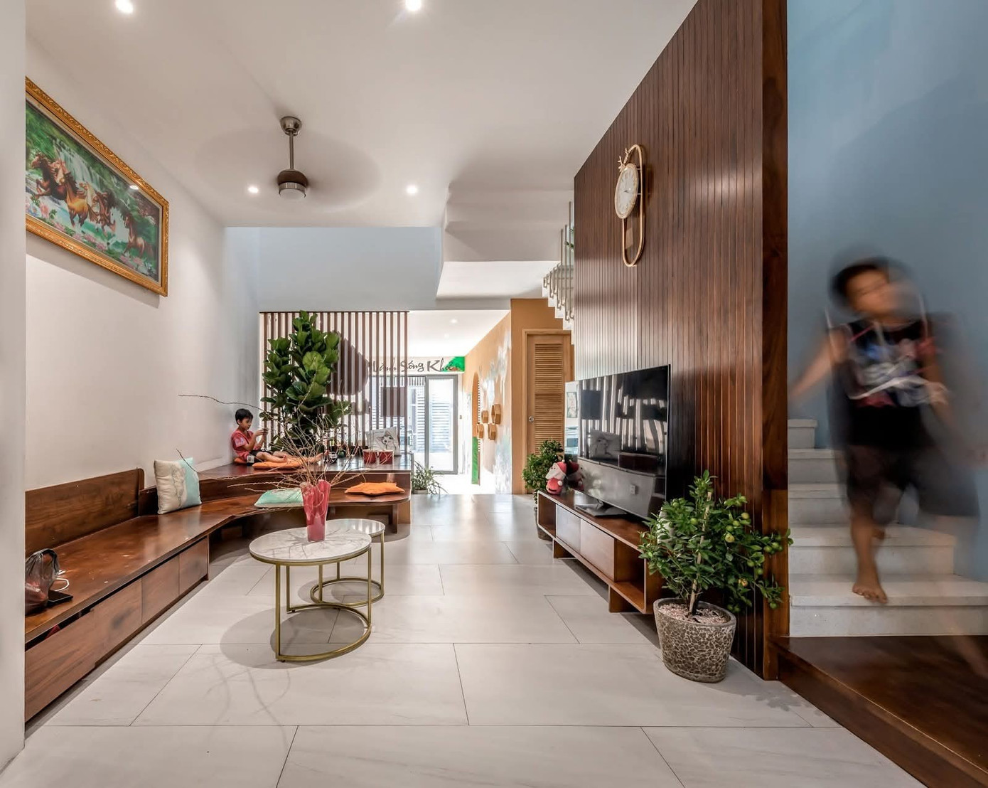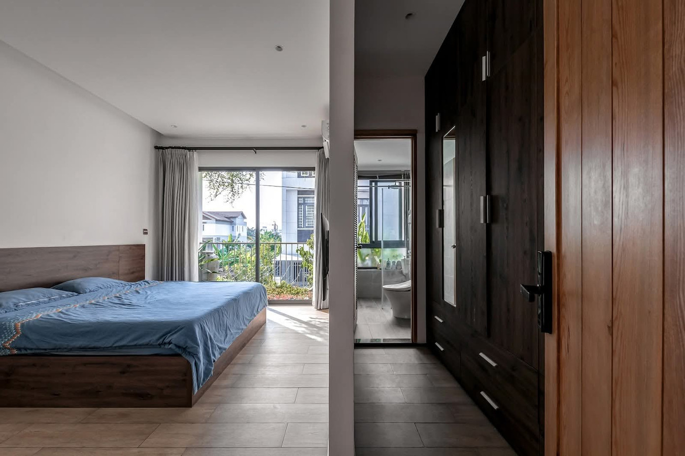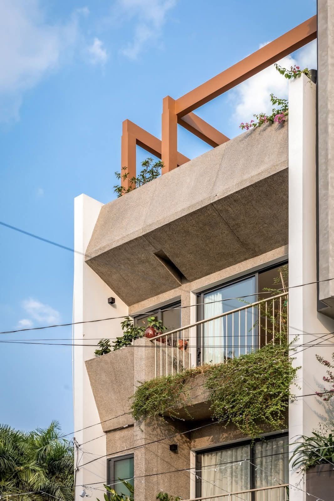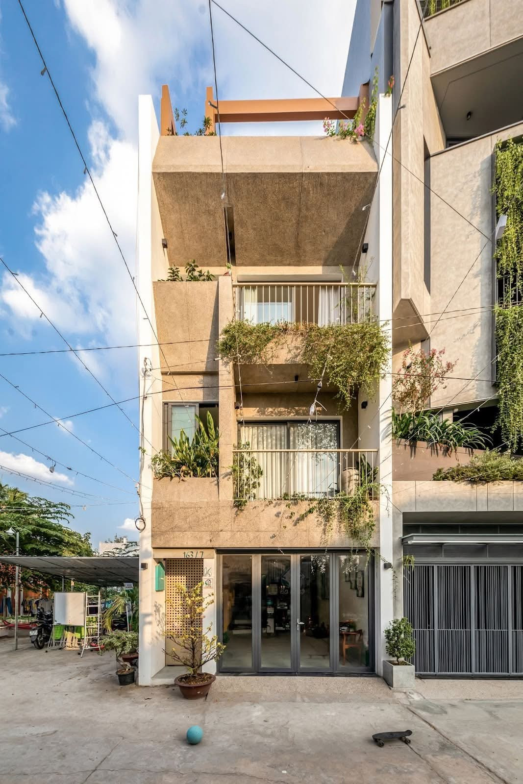 Ngôi nhà phố 4 tầng được thiết kế với mặt tiền đan xen ban công cây xanh và những khoảng thông tầng để ánh sáng và gió tự nhiên len lỏi qua mọi không gian — khiến dù trong lòng thành phố chật hẹp, tổ ấm vẫn rộng mở và thoáng đãng.