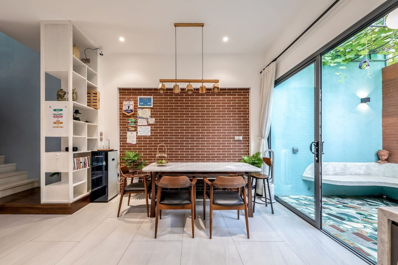 Bếp và bàn ăn có thể mở tầm nhìn ra ngoài sân hiên trồng cây xanh leo giàn. Vừa đủ sáng, thoáng mà vẫn có thể thêm vào màu xanh thiên nhiên.
