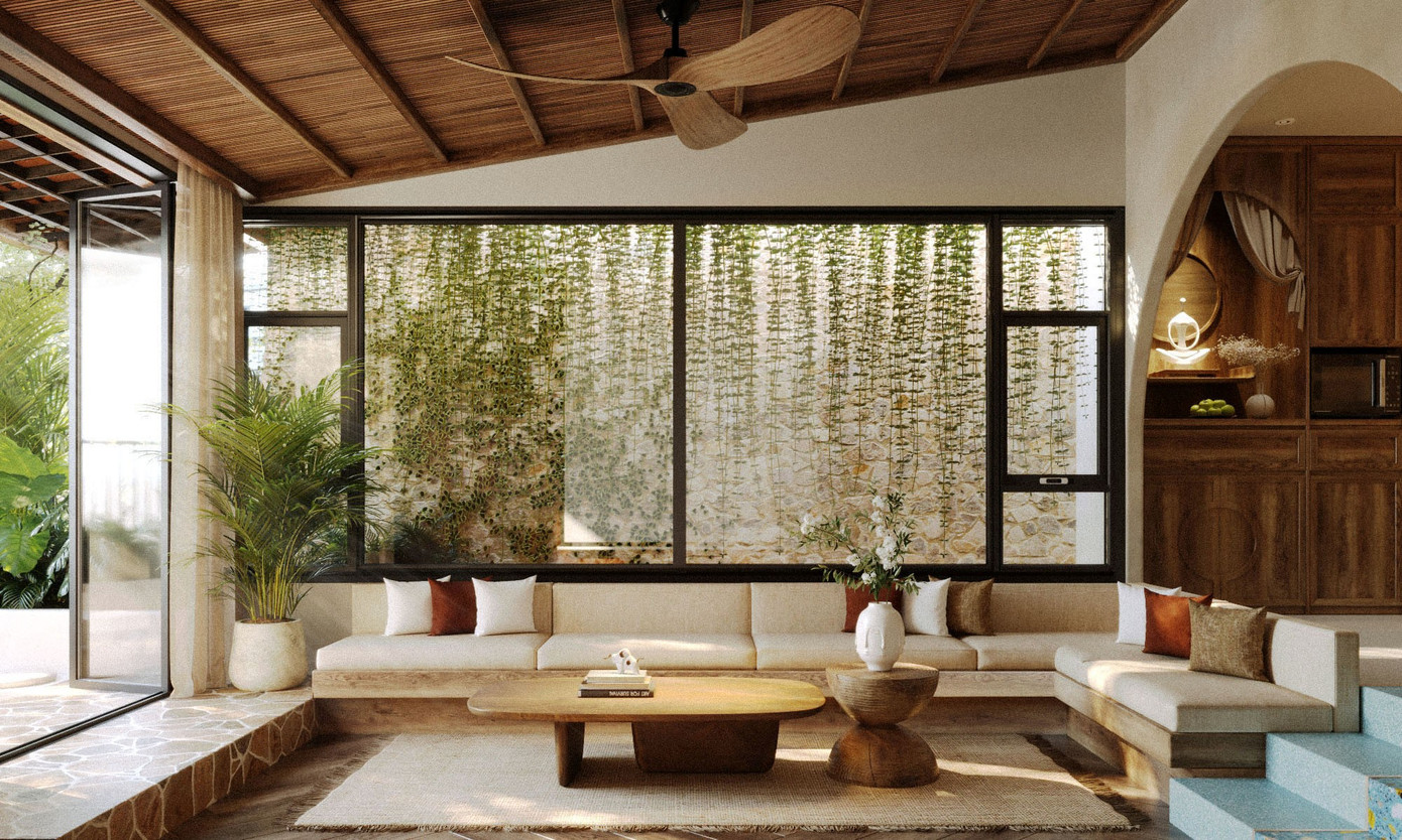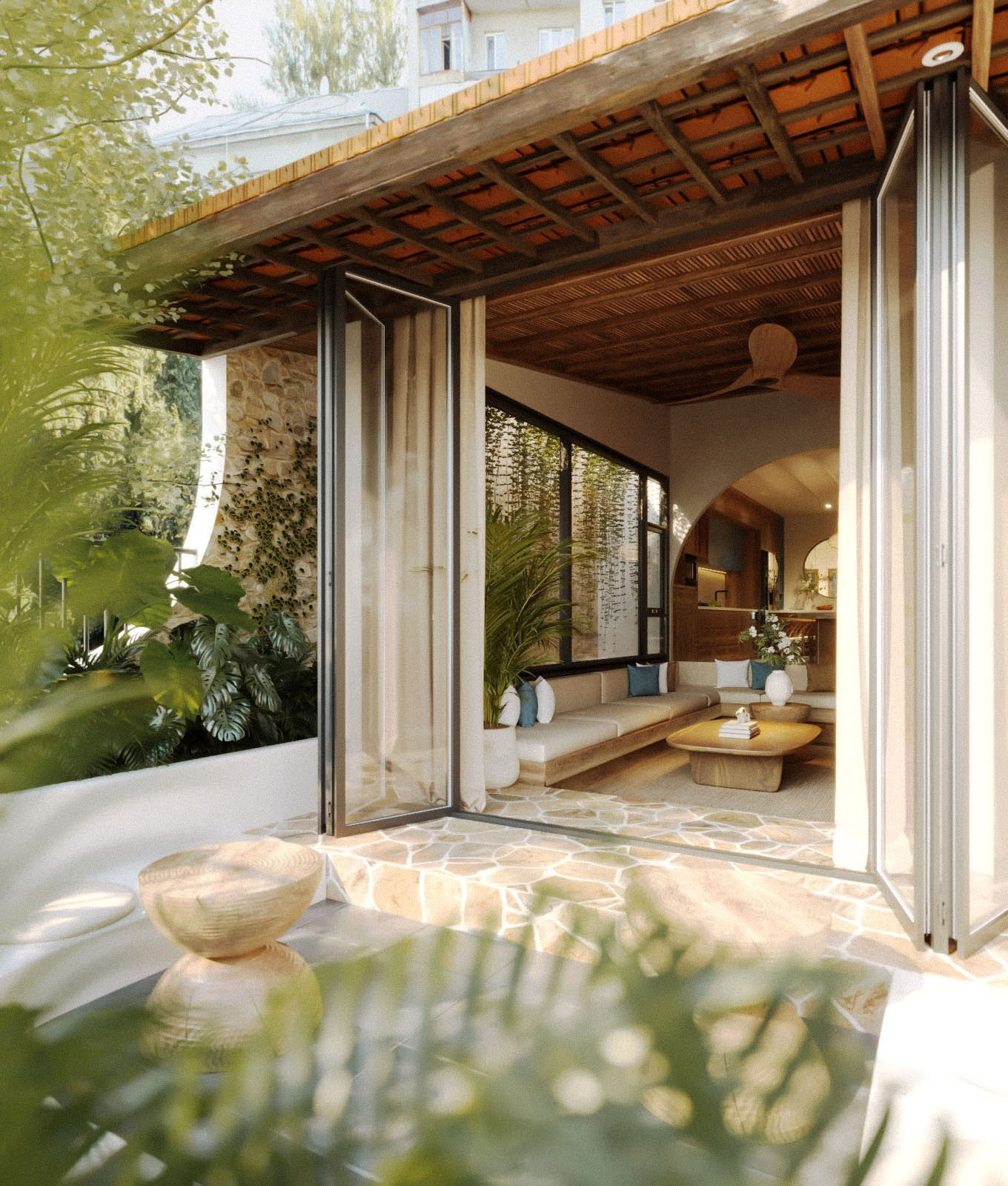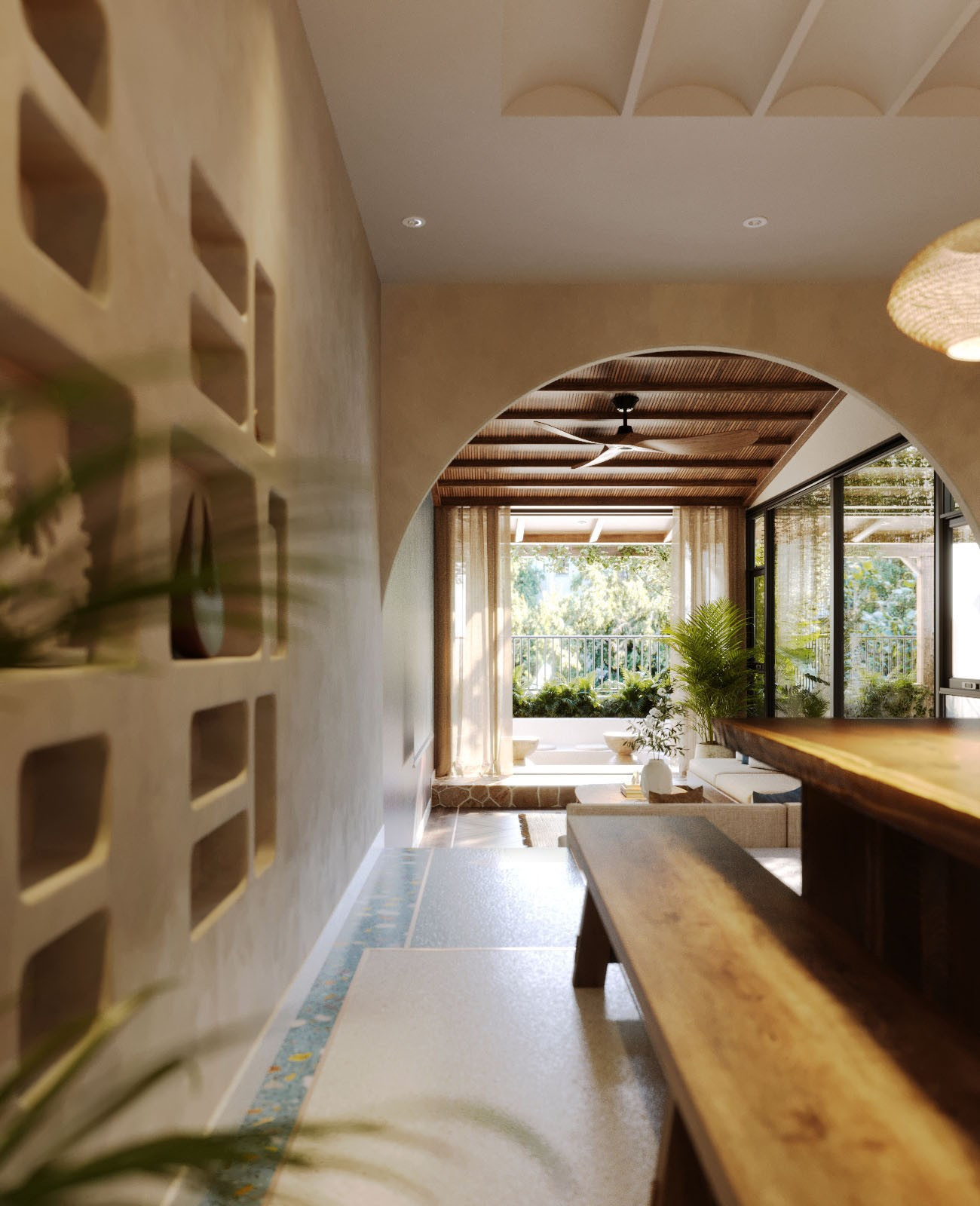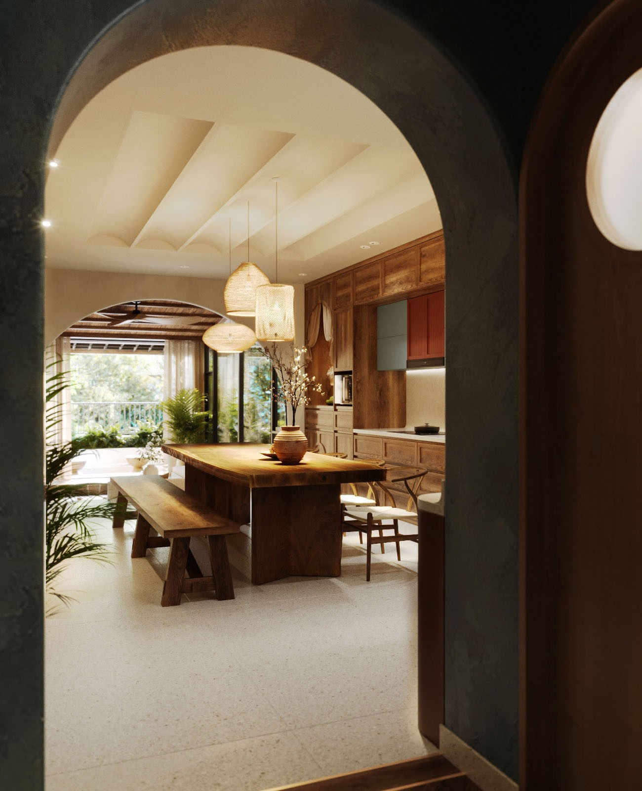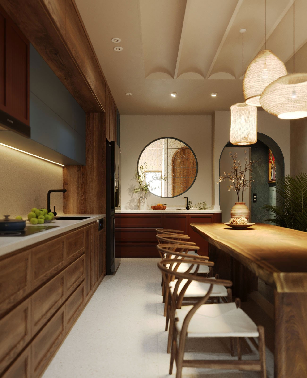 Ngôi nhà phố hẹp ngang, nên phương án đưa lối lưu thông cầu thang bộ và thang máy về cuối công trình, đưa phòng khách sinh hoạt và khu vực bếp, ăn lên tầng trên cùng, tạo không gian thoáng đãng khi kết hợp mái ngói, vườn cây để tăng sự thuần túy, mộc mạc cho không gian sinh hoạt.