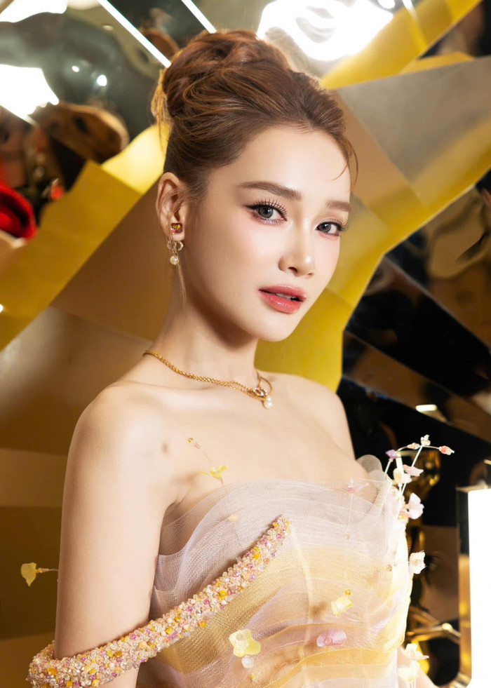 Ở một khoảnh khắc khác, Nhã Phương lựa chọn mẫu váy hồng pastel dáng xòe rộng, được phủ lớp họa tiết lông vũ tinh xảo. Thiết kế giúp cô khoe trọn bờ vai thon và làn da mịn màng. Sự kết hợp giữa sắc hồng ngọt ngào và form váy thanh lịch tạo nên hình ảnh kiêu sa. Dù không sử dụng quá nhiều phụ kiện, cô vẫn nổi bật nhờ thần thái rạng rỡ và nụ cười tươi đặc trưng.