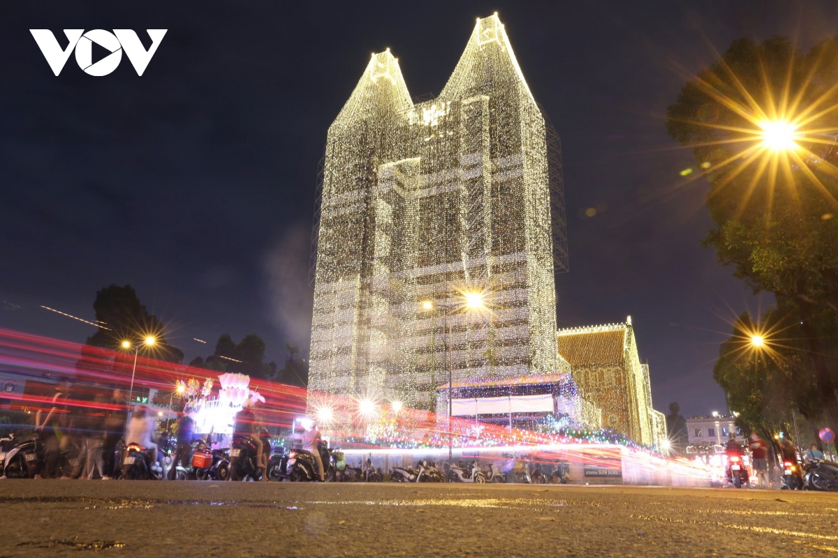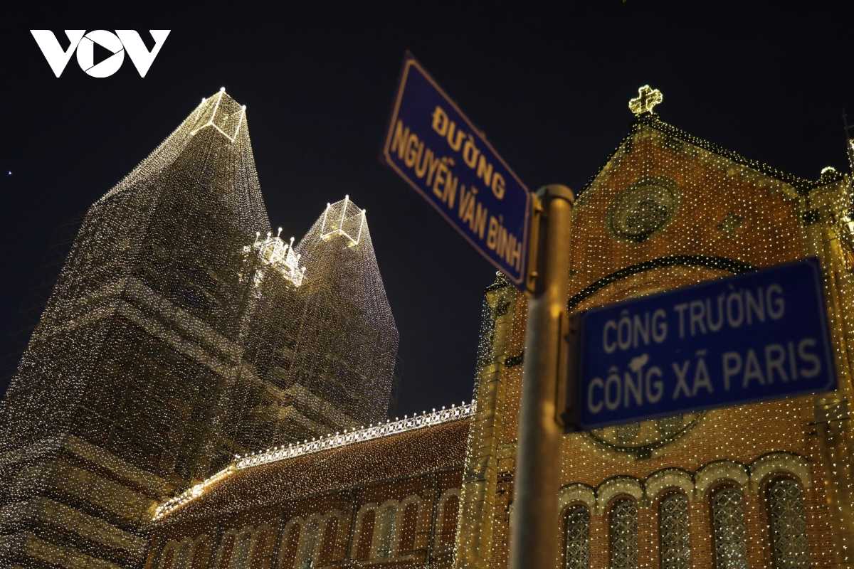 Ánh sáng lung linh được tạo bởi 1.000km dây đèn LED khiến Nhà thờ Đức Bà trở thành điểm đến thu hút đông đảo du khách, người dân và giới trẻ tìm đến chiêm ngưỡng, chụp ảnh. (Ảnh: T.H)