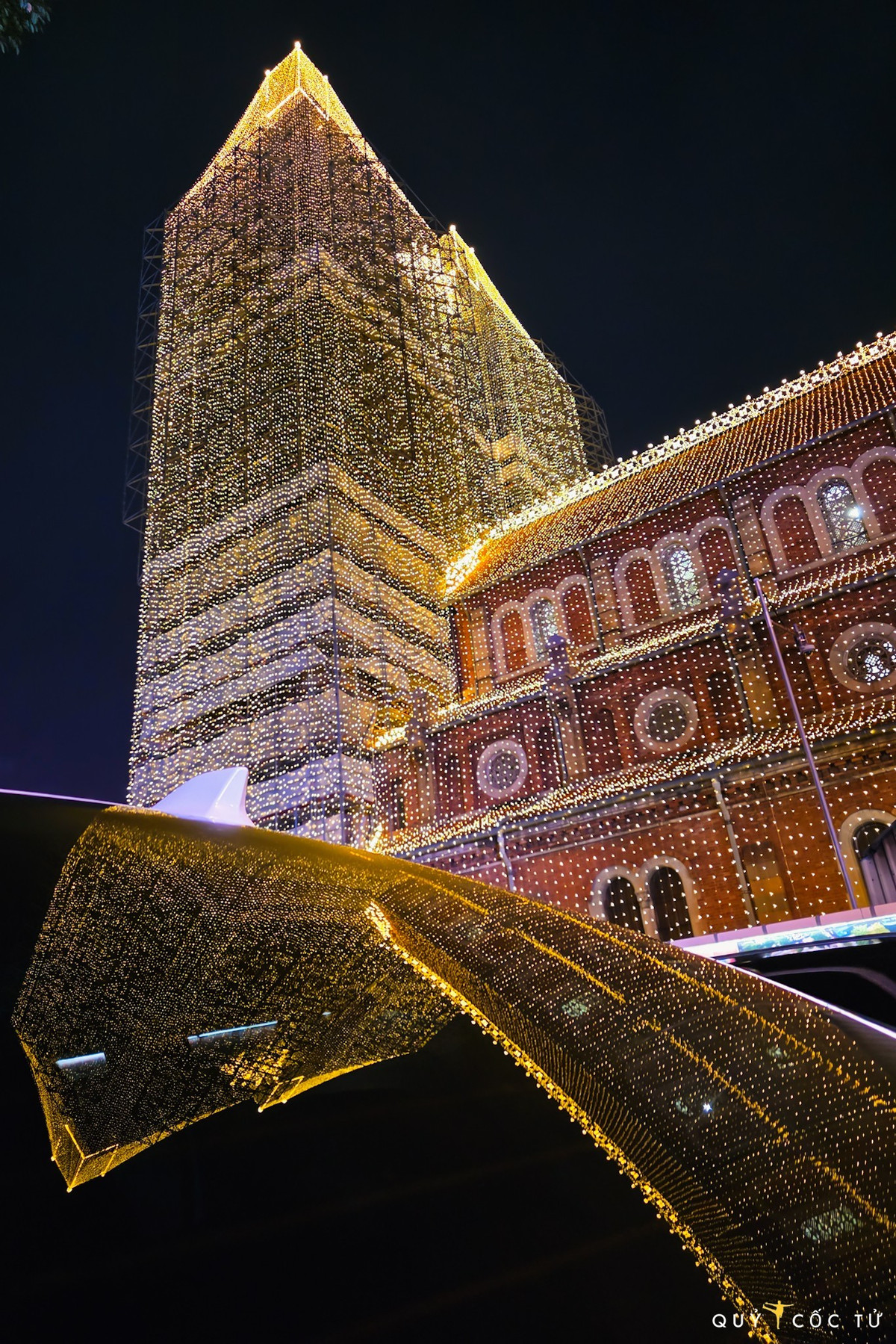 Dù công trình vẫn còn giàn giáo sau thời gian dài trùng tu, việc chiếu sáng đã giúp không gian trở nên rực rỡ hơn, che bớt những phần kỹ thuật và mang lại diện mạo mới cho biểu tượng kiến trúc của Sài Gòn.