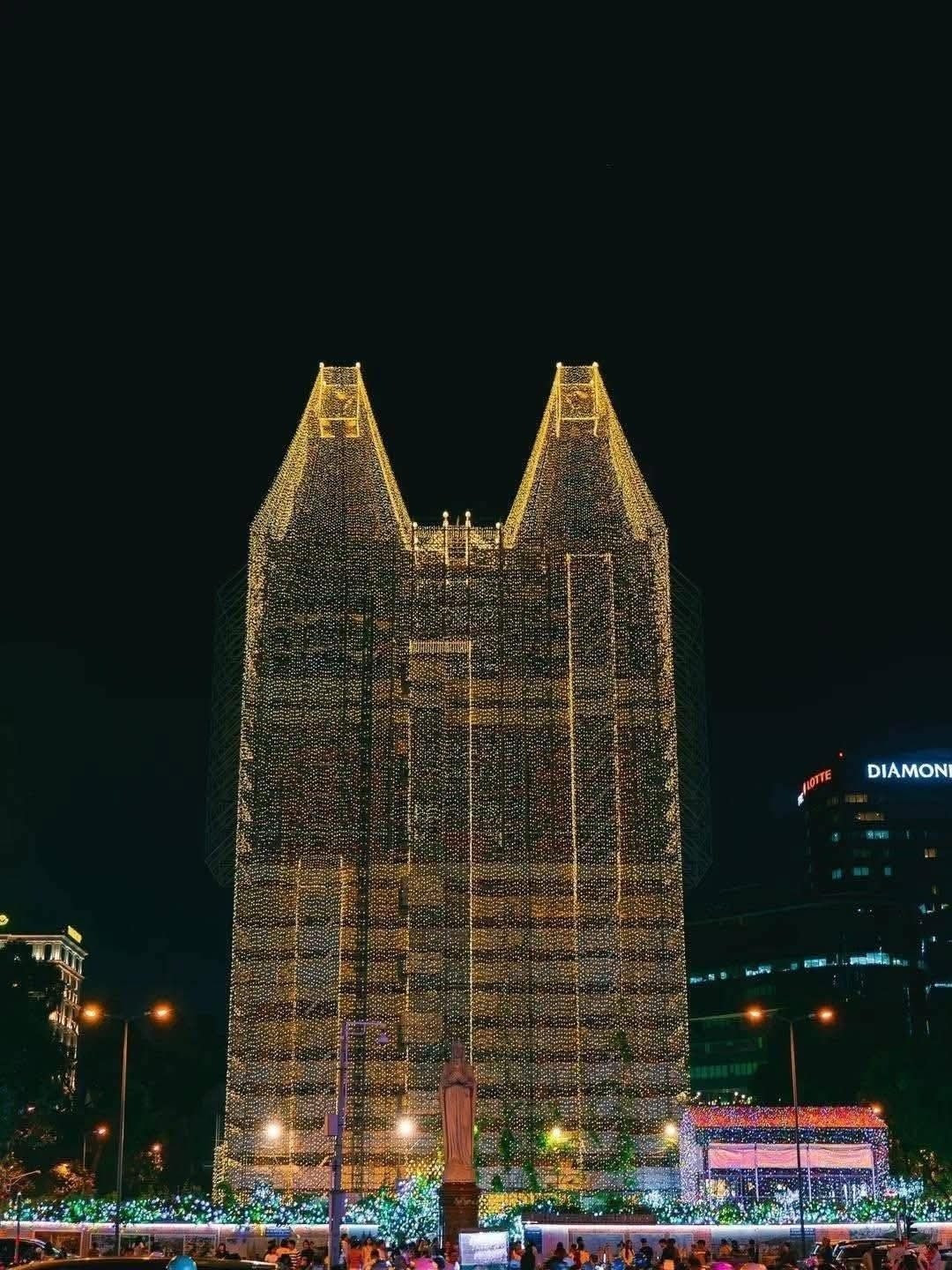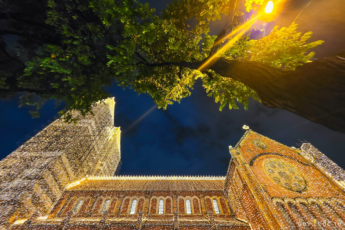 Nhìn từ xa, công trình gần 150 năm tuổi như được quấn bởi những dải lụa phát sáng, nổi bật trong đêm. Ảnh Ngo Tran Hai An