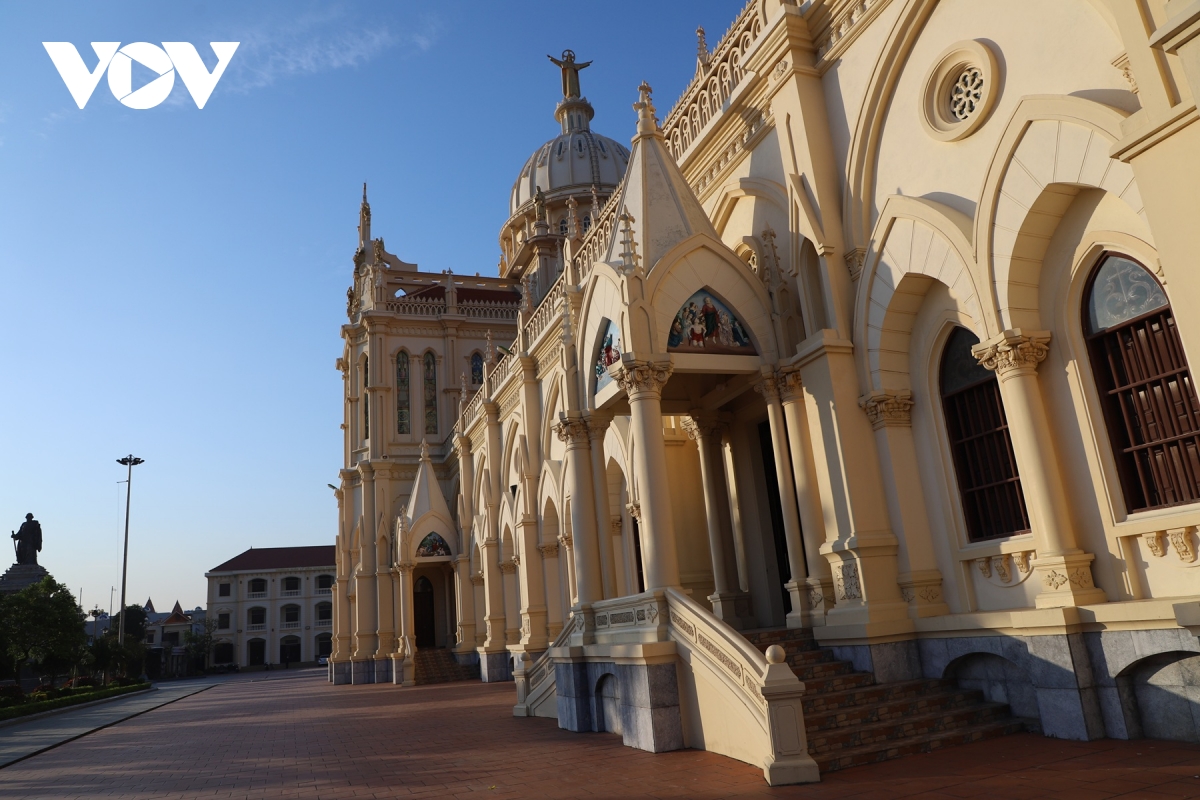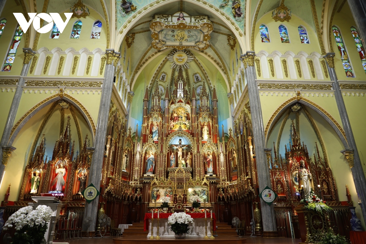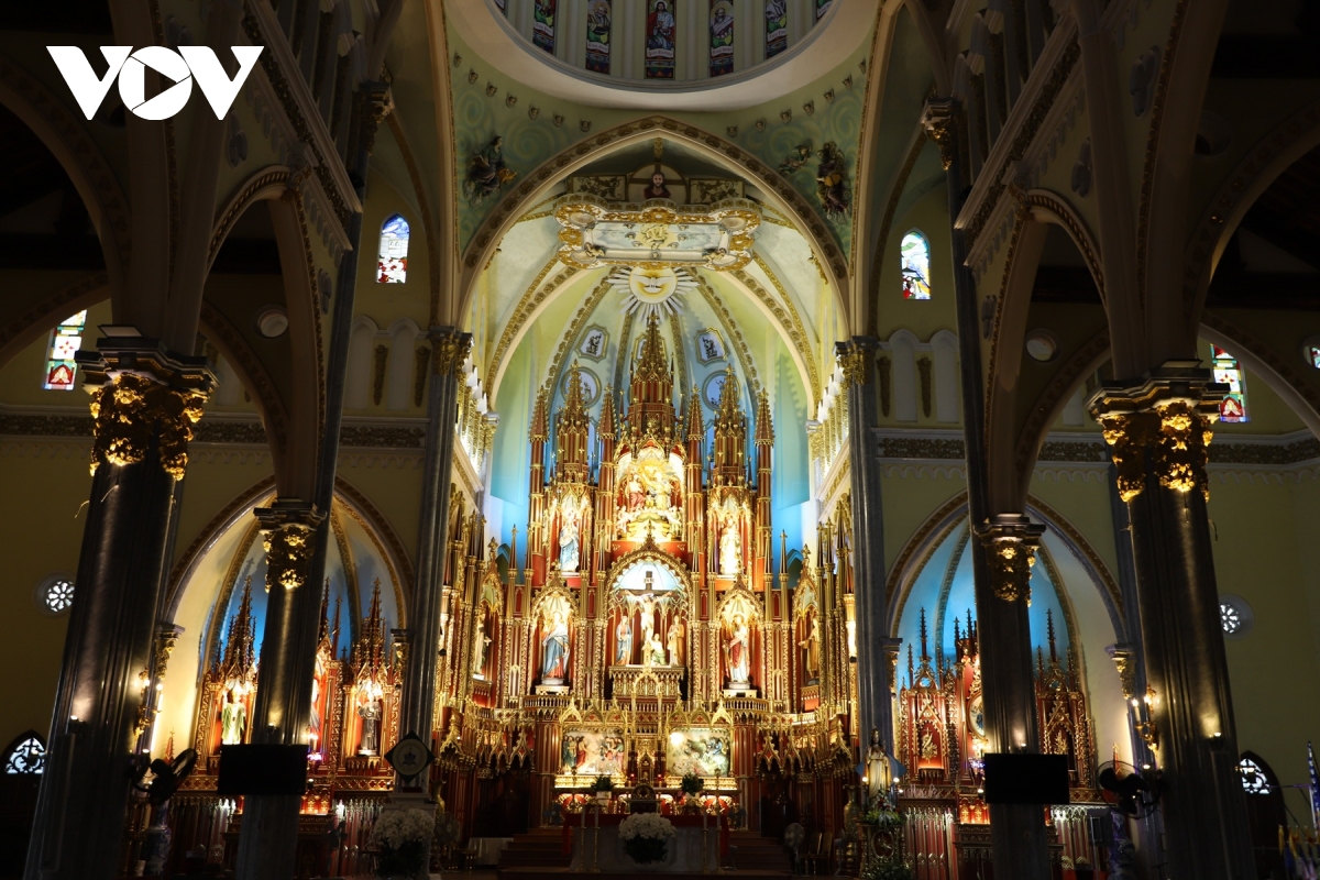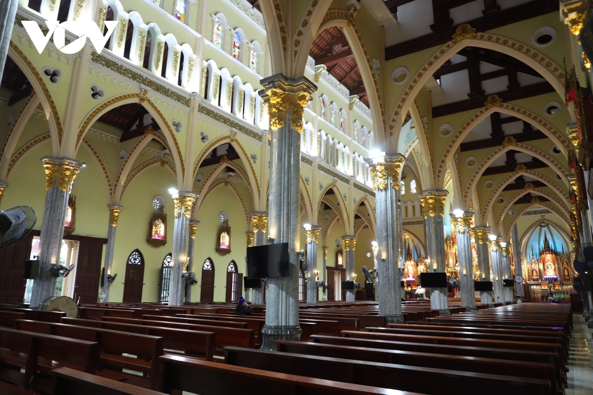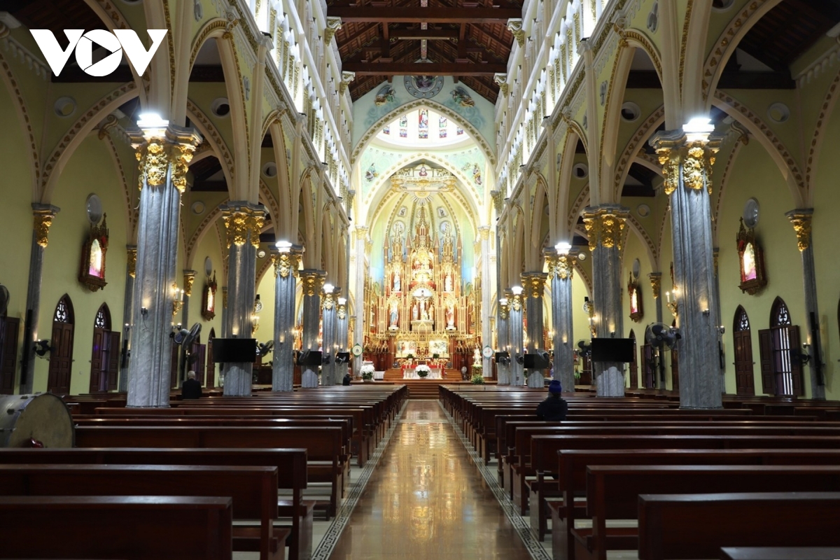Nội thất thánh đường được thiết kế rộng thoáng, trần cao, kết hợp hệ cột lớn tạo sự uy nghi và trang trọng trong các nghi thức phụng vụ.