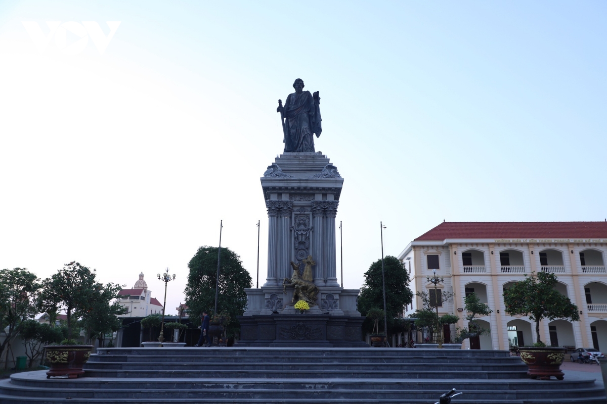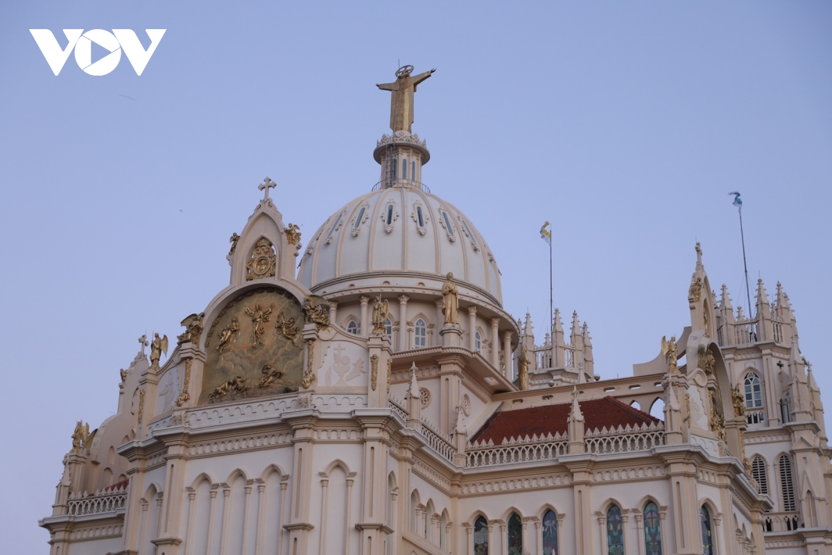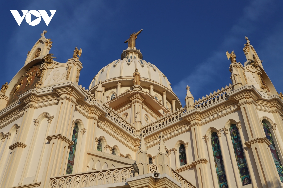 Từ sau nhà thờ, mái vòm cùng hoa văn họa tiết đắp nổi cầu kỳ thể hiện bàn tay tài hoa của người thợ.