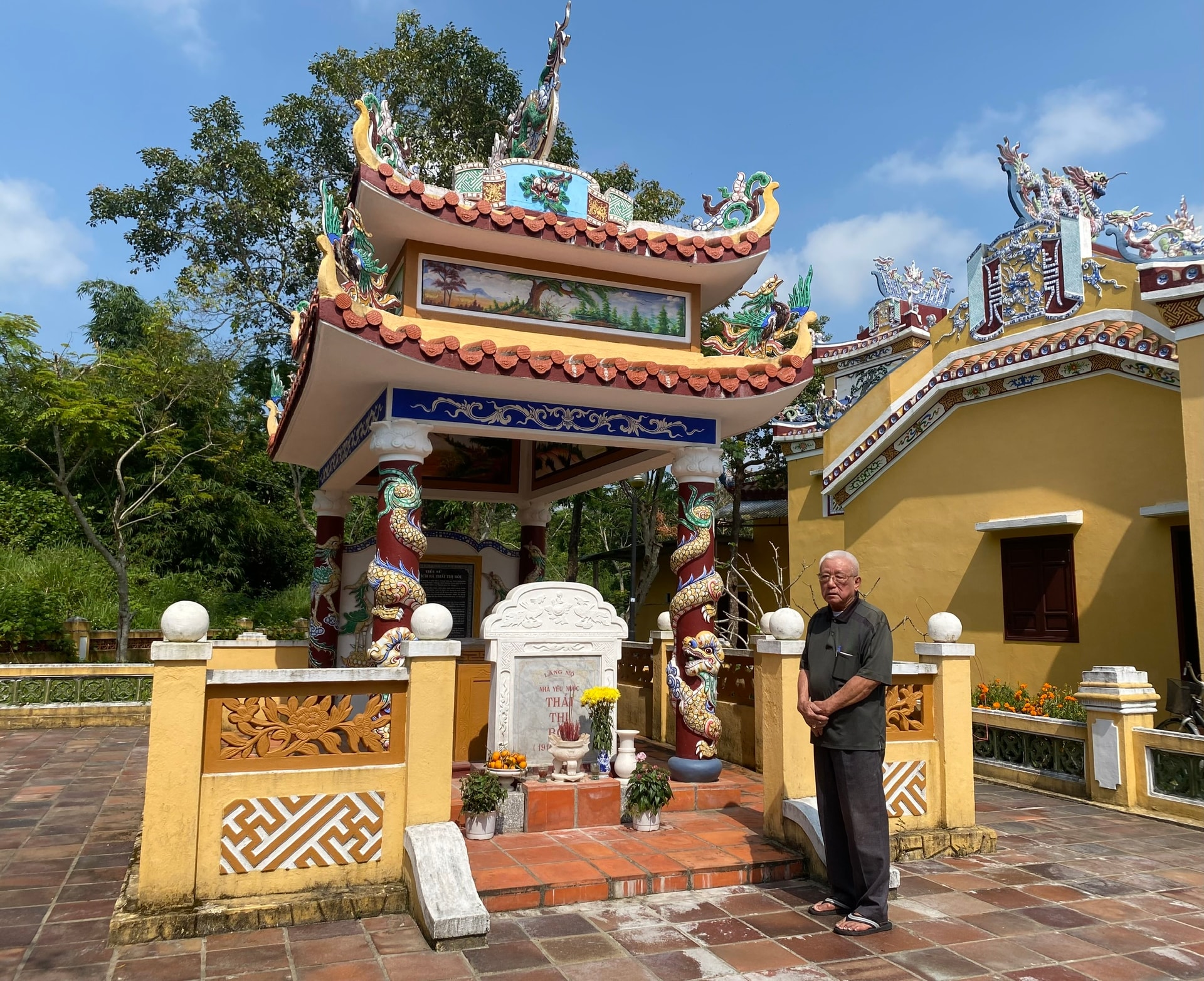 Ông Thái Nhi bên lăng mộ nhà yêu nước Thái Thị Bôi. Ảnh: VĨNH LỘC