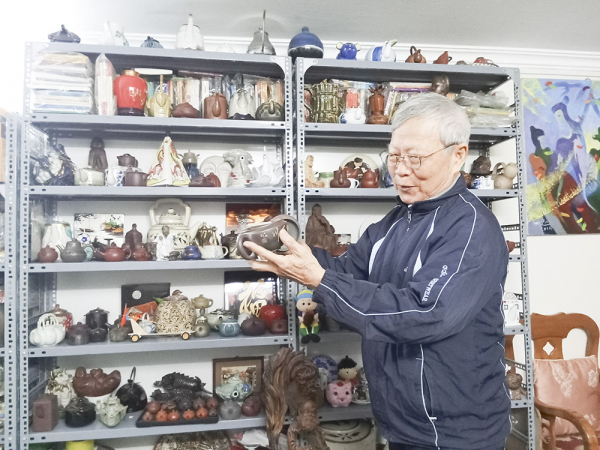 Trong căn phòng nhỏ, diện tích 25 mét vuông, vừa là nơi viết lách lại vừa là nơi “trưng bày” những chiếc ấm trà sưu tầm được. Ông nhà thơ hào hứng lấy từng chiếc ấm ra để giới thiệu với khách. Đó đều là những chiếc ấm trà hầu hết được chế tác bằng gốm, số ít được làm bằng sành, sứ, thủy tinh và đồng. Mỗi chiếc ấm không chỉ là dụng cụ để pha trà mà trên hết đó là những “tác phẩm nghệ thuật” bởi hình dạng, chất liệu và độ quý hiếm của nó.
