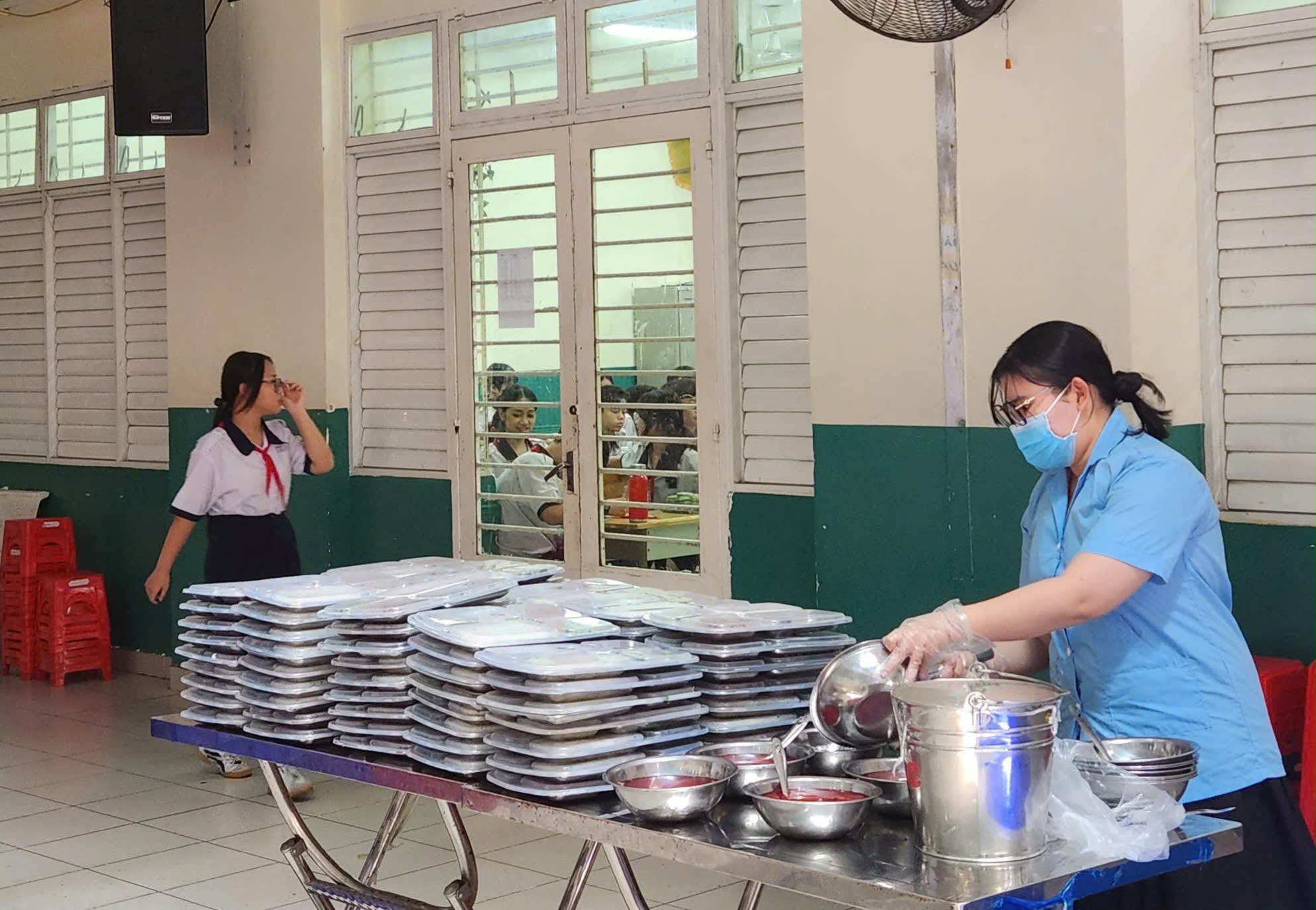 Nhân viên Trường THCS Lữ Gia, phường Phú Thọ, TP.HCM chia thức ăn cho học sinh. Ảnh: NGUYỄN QUYÊN