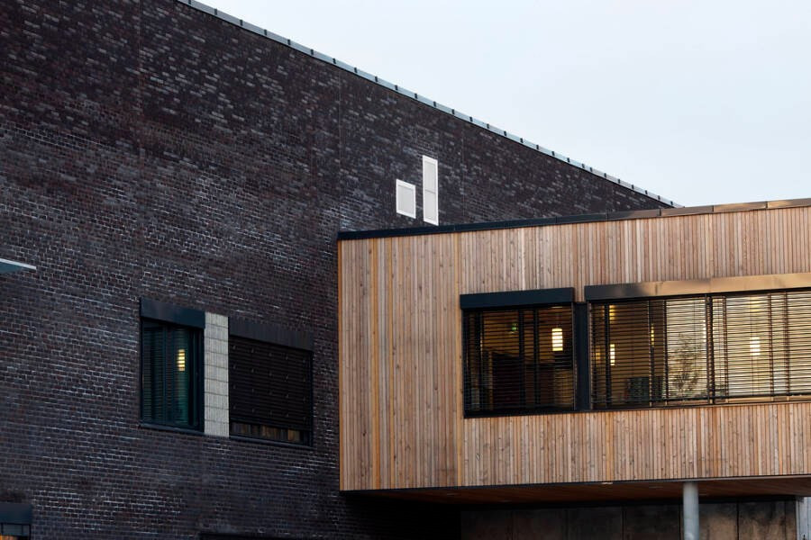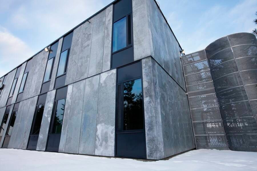 Các tòa nhà 2 tầng tại nhà tù Halden được xây bằng gạch nung, gỗ chưa qua xử lý và thép mạ kẽm. Nội thất được sơn và thiết kế theo từng khu vực riêng như khu nhà ở, khu giải trí, nơi làm việc, trường học và cửa hàng. Ảnh: Wikimedia Commons.