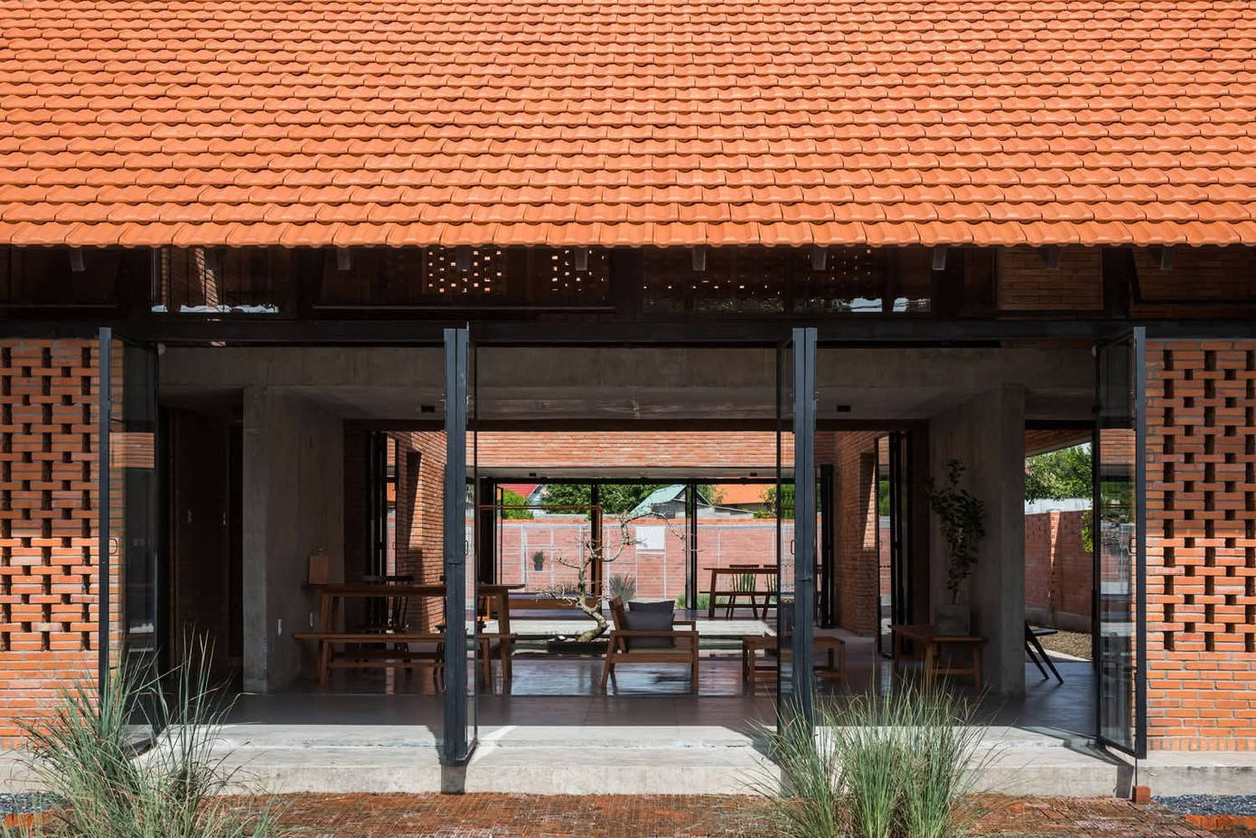 Hệ mái cao, không gian mở và các lớp bao che linh hoạt giúp ngôi nhà “thở” đúng nghĩa, giảm bức xạ nhiệt và đón gió tự nhiên hiệu quả.