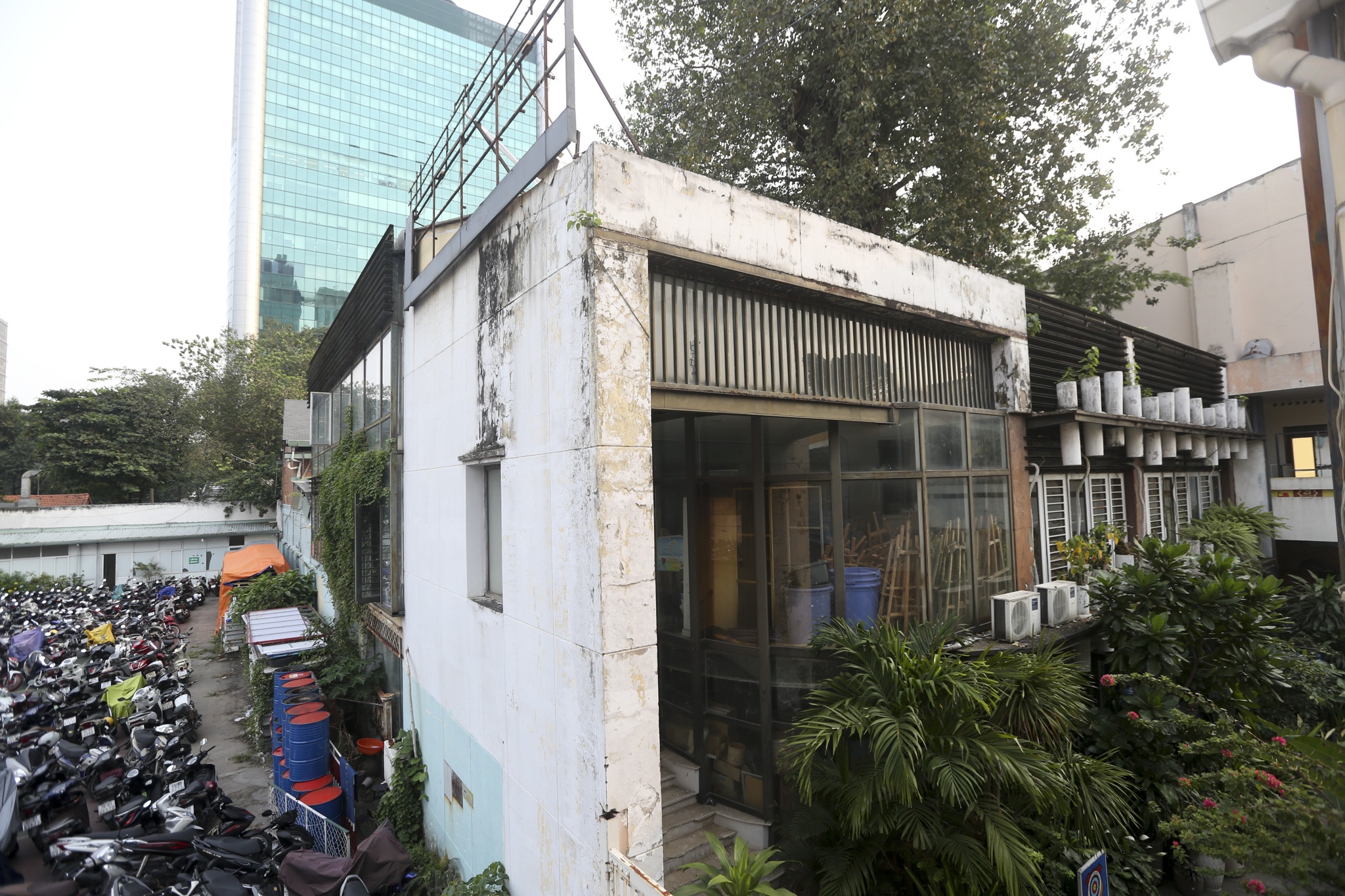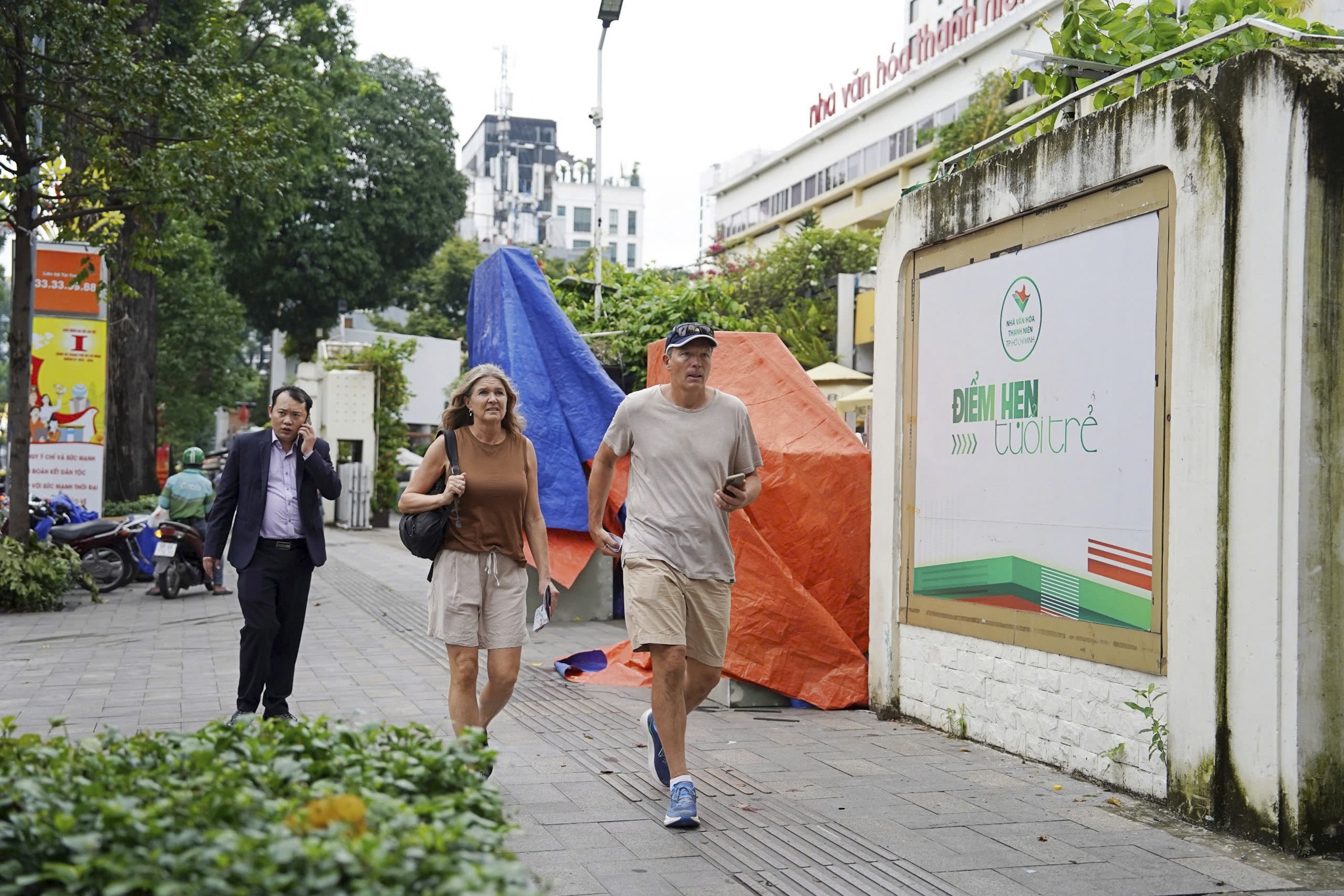 Khu vực bên ngoài nhà văn hóa cũng đã xuống cấp. Dù nằm ở vị trí mặt tiền đường Phạm Ngọc Thạch, bảng tên, cổng chào bị bám rêu xanh, mọc cỏ dại, thậm chí phải phủ bạt, gây ảnh hưởng đến tính thẩm mỹ nói chung.