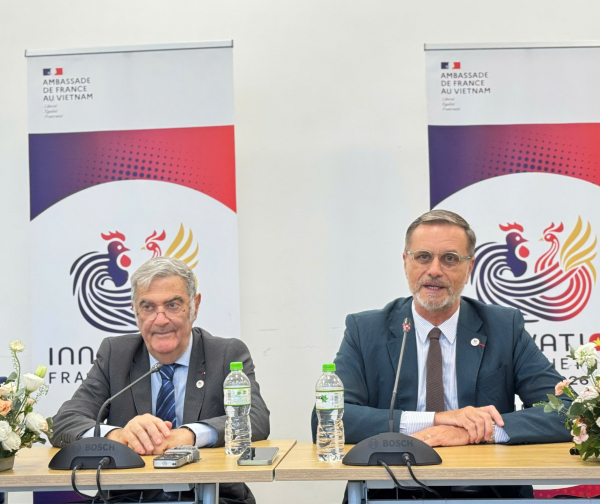 Đại sứ Pháp tại Việt Nam Olivier Brochet (phải) nhấn mạnh, Pháp đang thúc đẩy hệ sinh thái đổi mới sáng tạo đa dạng tại Việt Nam.