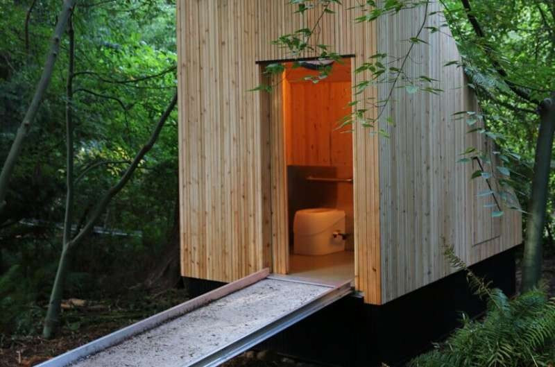 Cấu trúc nhà vệ sinh gồm những tấm gỗ với lớp vỏ ngoài bằng gỗ tuyết tùng chống mục, kháng khuẩn, mái xanh và một quạt tiết kiệm điện để lưu thông không khí. Hệ thống sẽ tách chất thải rắn và lỏng, chất rắn được dẫn vào ngăn có lót nấm sợi. Tại đây, vi sinh vật phân hủy chất thải rắn thành phân hữu cơ, còn nấm hấp thụ mùi hôi.