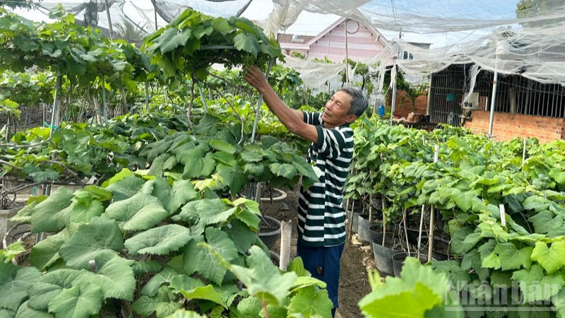 Nông dân làm nho kiểng tại các xã phía nam tỉnh Khánh Hòa tạo dáng cây nho theo phong cách mới, là thân cây vươn thẳng, tán gọn, trên thân buông đều nhiều chùm quả. (Ảnh: NGUYỄN TRUNG)